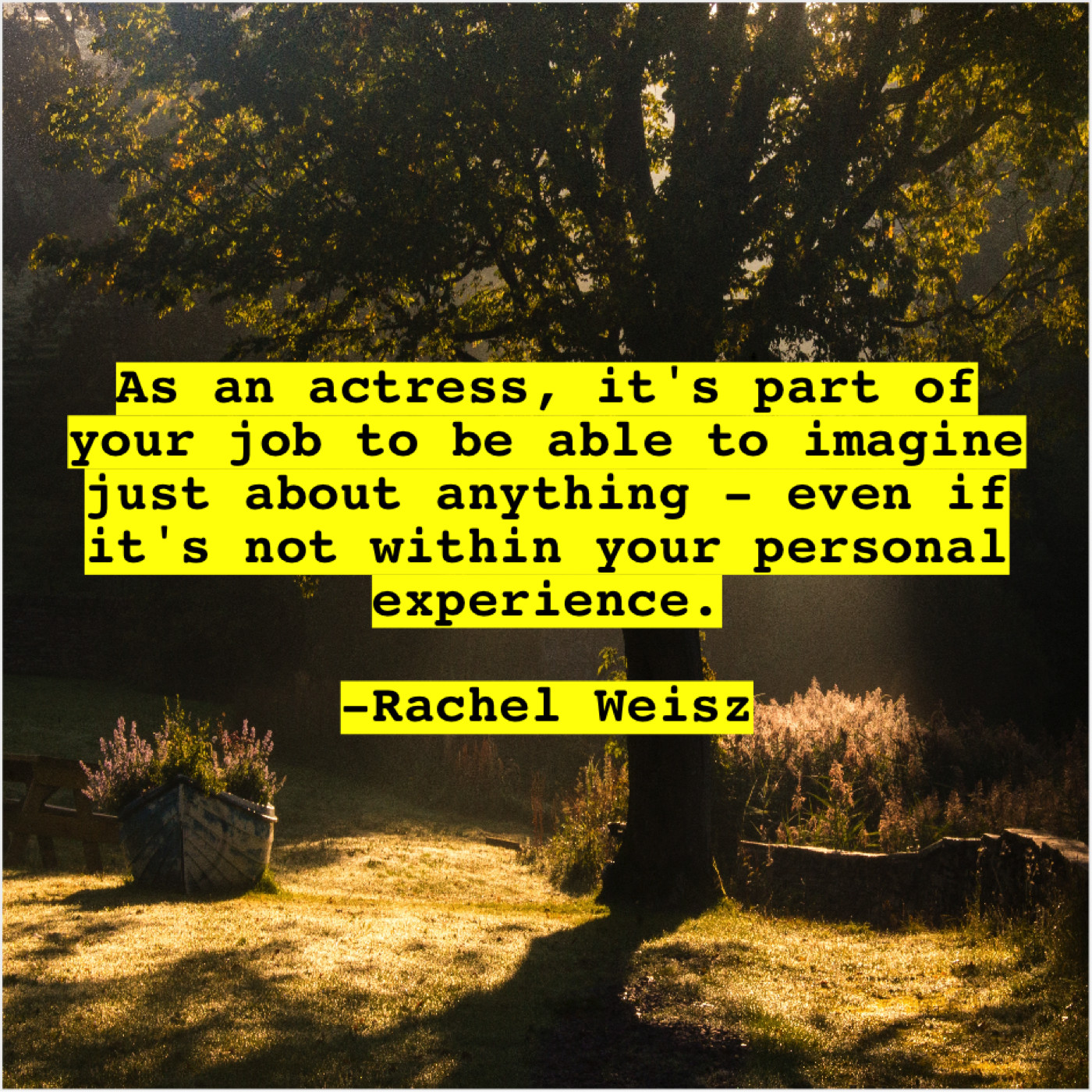 Rachel Weisz Rachel Weisz – As an actress, it’s part… September 23, 2019 admin “As an actress, it’s part of your job to be able to imagine just about anything – even if it’s not within your personal experience.”-Rachel Weisz