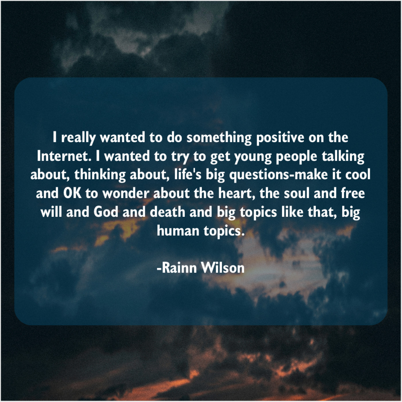“I really wanted to do something positive on the Internet. I wanted to try to get young people talking about, thinking about, life’s big questions-make it cool and OK to wonder about the heart, the soul and free will and God and death and big topics like that, big human topics.”