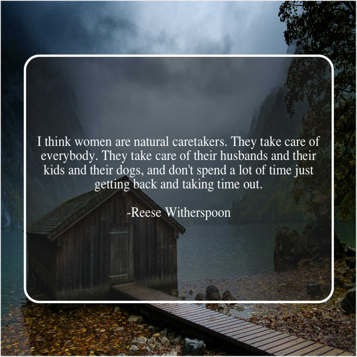 Reese Witherspoon Reese Witherspoon – I think women are natural… January 3, 2019 admin “I think women are natural caretakers. They take care of everybody. They take care of their husbands and their kids and their dogs, and don’t spend a lot of time just getting back and taking time out.”-Reese Witherspoon