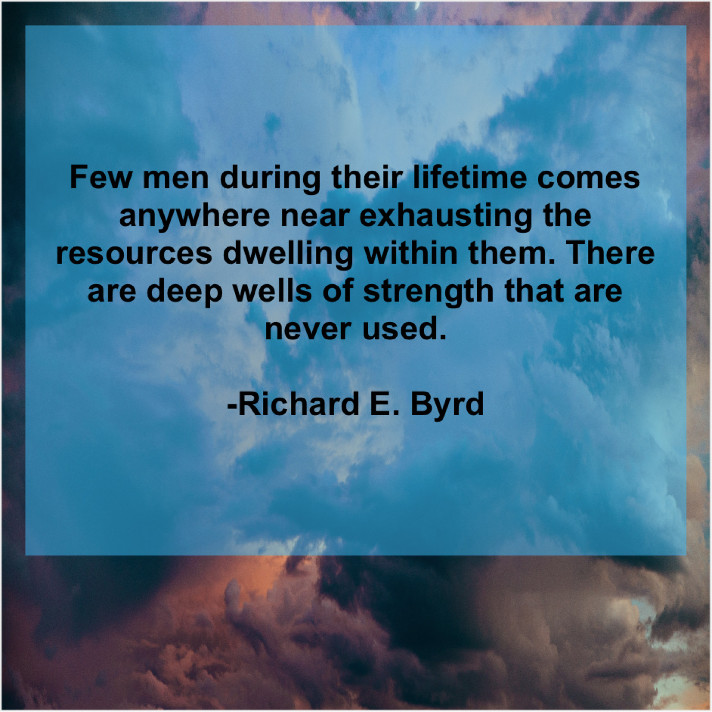 Richard E. Byrd Richard E. Byrd – Few men during their lifetime… December 2, 2018 admin “Few men during their lifetime comes anywhere near exhausting the resources dwelling within them. There are deep wells of strength that are never used.”-Richard E. Byrd