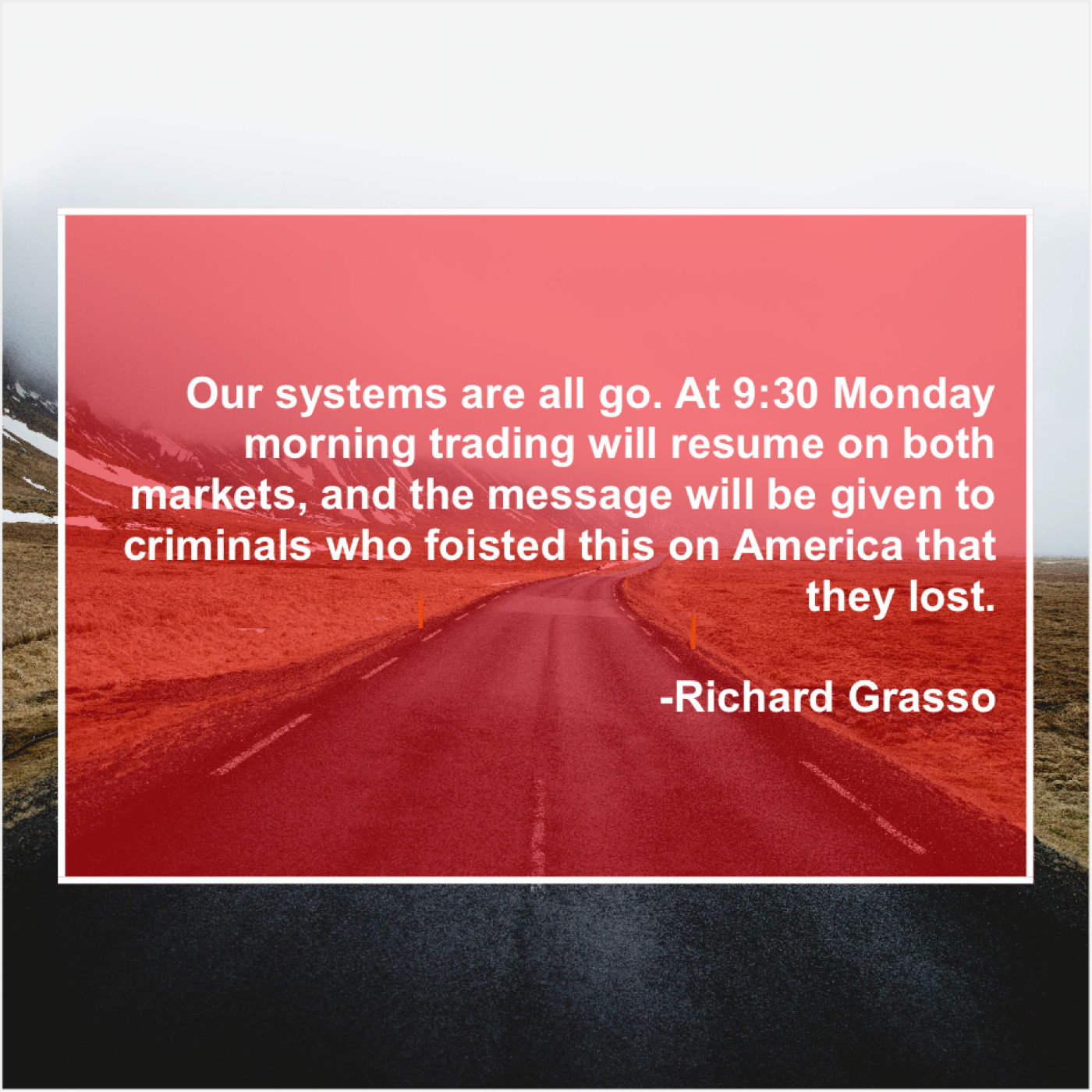 Richard Grasso Richard Grasso – Our systems are all go… October 6, 2019 admin “Our systems are all go. At 9:30 Monday morning trading will resume on both markets, and the message will be given to criminals who foisted this on America that they lost.”-Richard Grasso