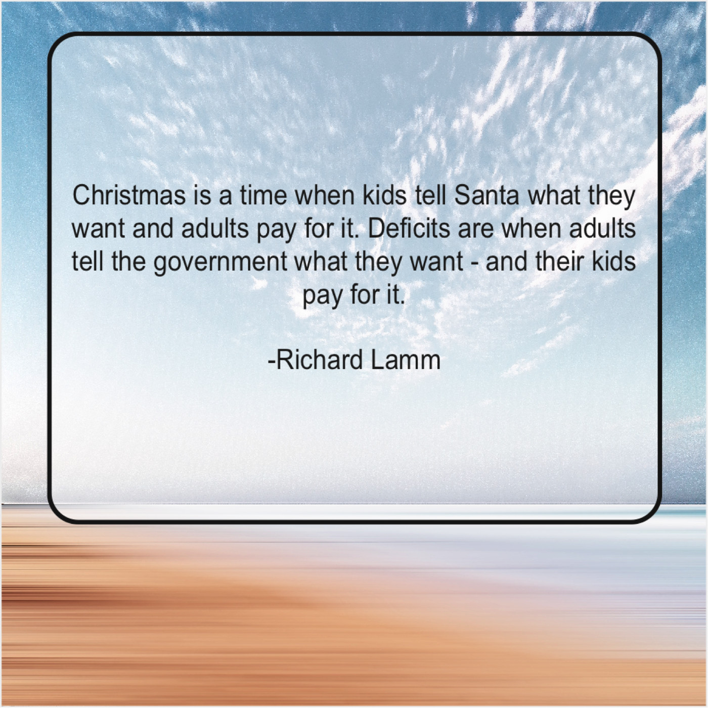 Richard Lamm Richard Lamm – Christmas is a time when… December 1, 2018 admin “Christmas is a time when kids tell Santa what they want and adults pay for it. Deficits are when adults tell the government what they want – and their kids pay for it.”-Richard Lamm