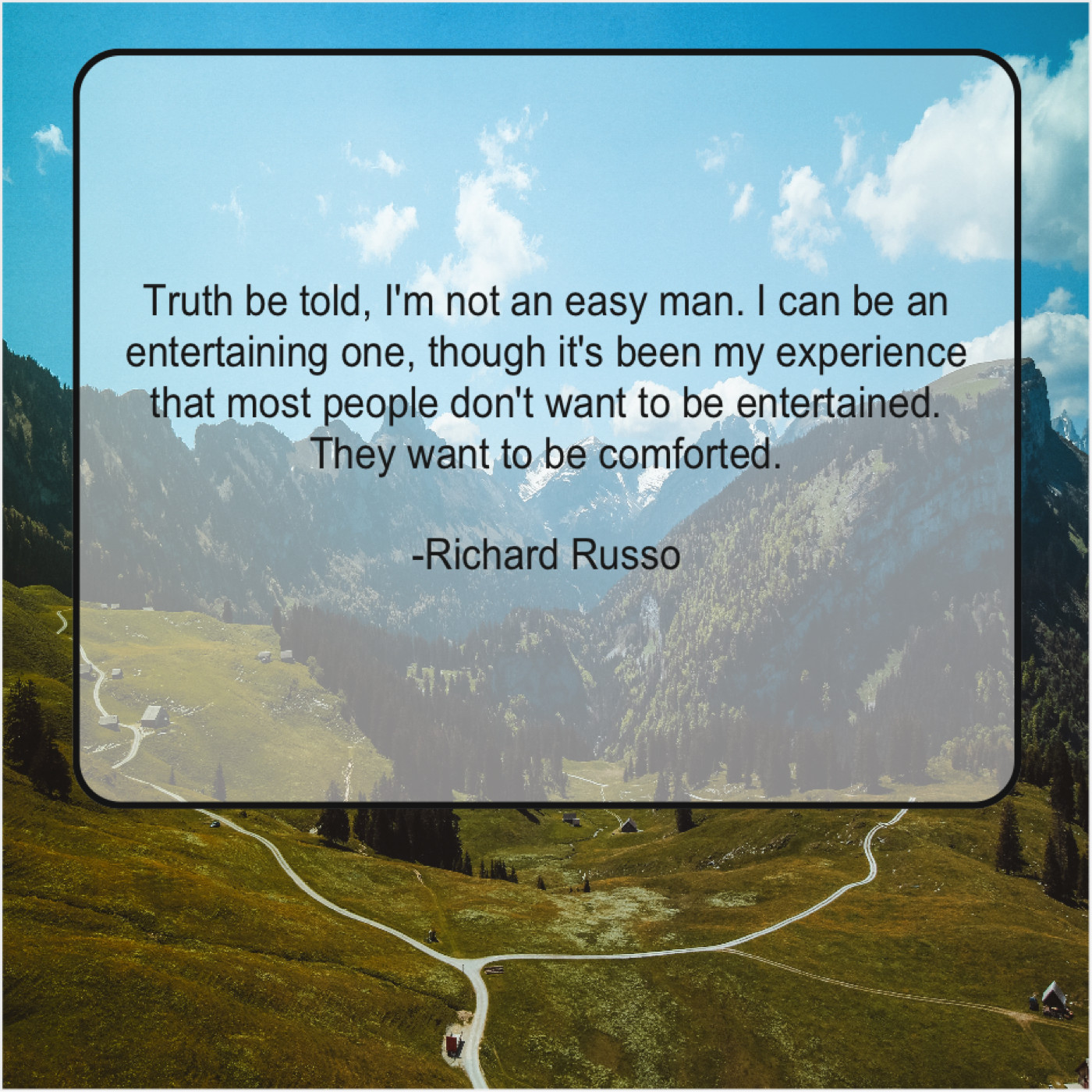 Richard Russo Richard Russo – Truth be told, I’m not… July 23, 2019 admin “Truth be told, I’m not an easy man. I can be an entertaining one, though it’s been my experience that most people don’t want to be entertained. They want to be comforted.”-Richard Russo