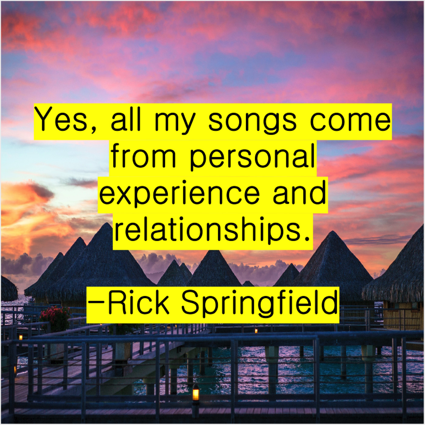 Rick Springfield Rick Springfield – Yes, all my songs come… February 7, 2019 admin “Yes, all my songs come from personal experience and relationships.”-Rick Springfield