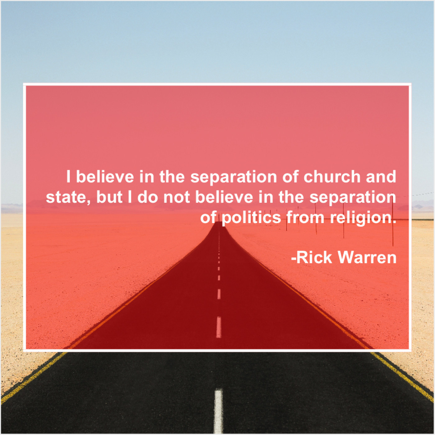 Rick Warren Rick Warren – I believe in the separation… January 25, 2019 admin “I believe in the separation of church and state, but I do not believe in the separation of politics from religion.”-Rick Warren