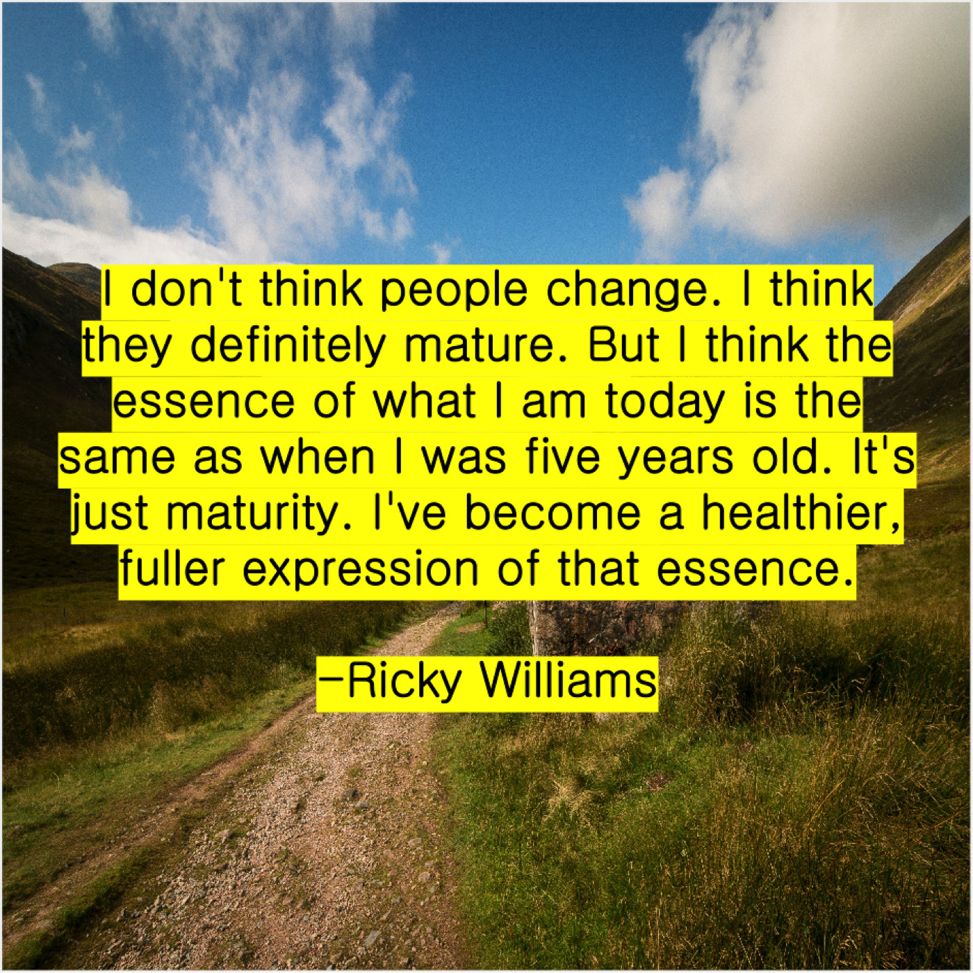 Ricky Williams Ricky Williams – I don’t think people change… December 14, 2018 admin “I don’t think people change. I think they definitely mature. But I think the essence of what I am today is the same as when I was five years old. It’s just maturity. I’ve become a healthier, fuller expression of that essence.”-Ricky Williams