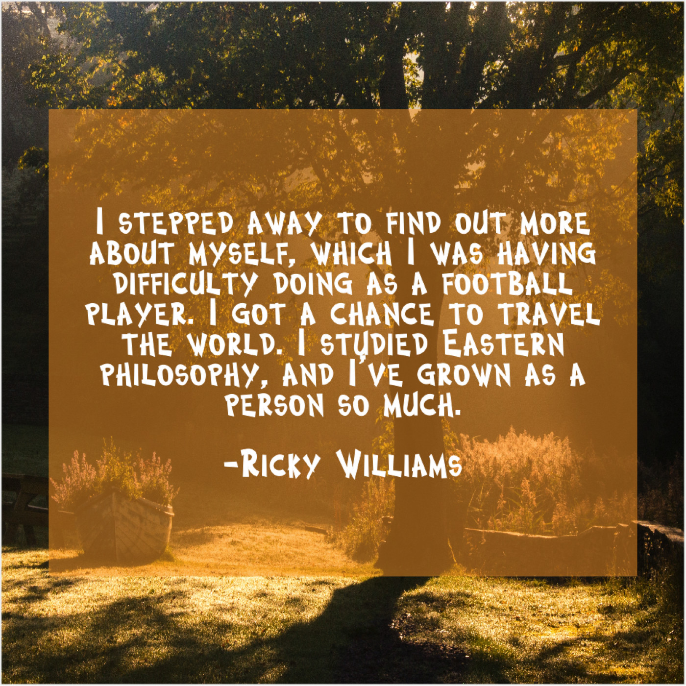 Ricky Williams Ricky Williams – I stepped away to find… October 14, 2019 admin “I stepped away to find out more about myself, which I was having difficulty doing as a football player. I got a chance to travel the world. I studied Eastern philosophy, and I’ve grown as a person so much.”-Ricky Williams