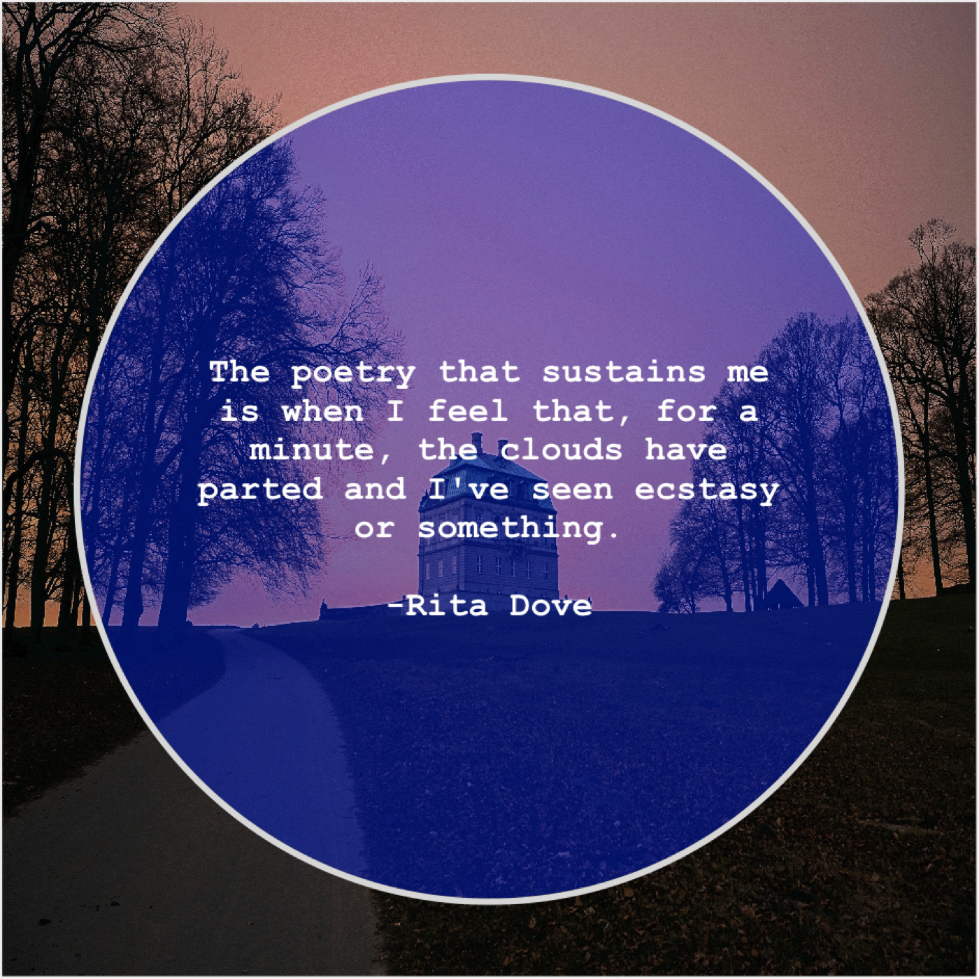 Rita Dove Rita Dove – The poetry that sustains me… October 31, 2018 admin “The poetry that sustains me is when I feel that, for a minute, the clouds have parted and I’ve seen ecstasy or something.”-Rita Dove