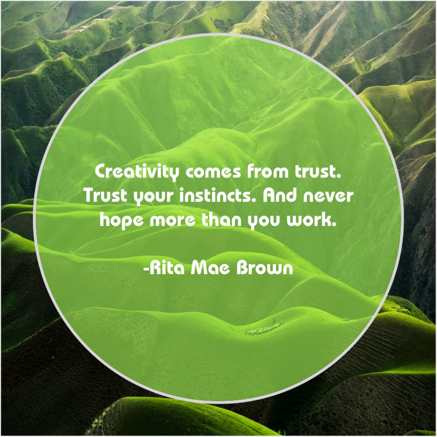 Rita Mae Brown Rita Mae Brown – Creativity comes from trust. Trust… August 5, 2019 admin “Creativity comes from trust. Trust your instincts. And never hope more than you work.”-Rita Mae Brown