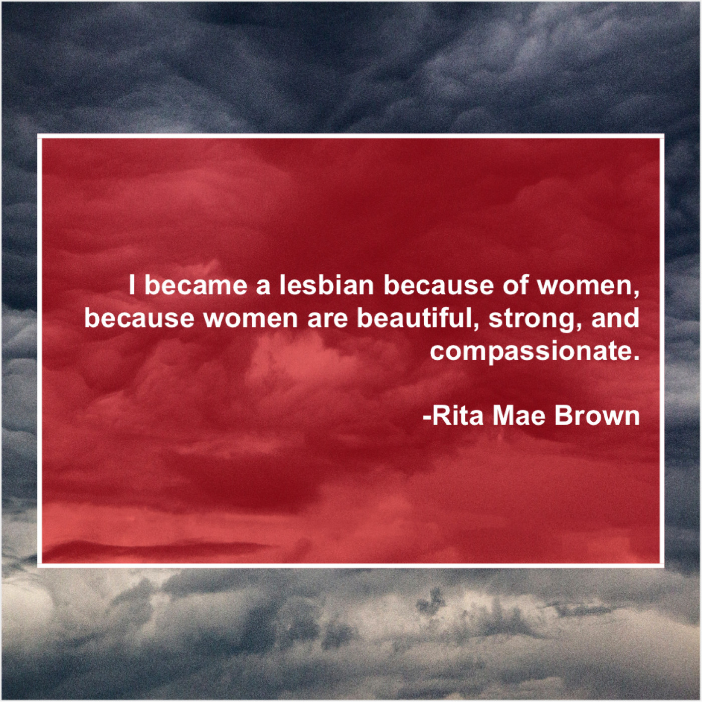 Rita Mae Brown Rita Mae Brown – I became a lesbian because… January 16, 2019 admin “I became a lesbian because of women, because women are beautiful, strong, and compassionate.”-Rita Mae Brown
