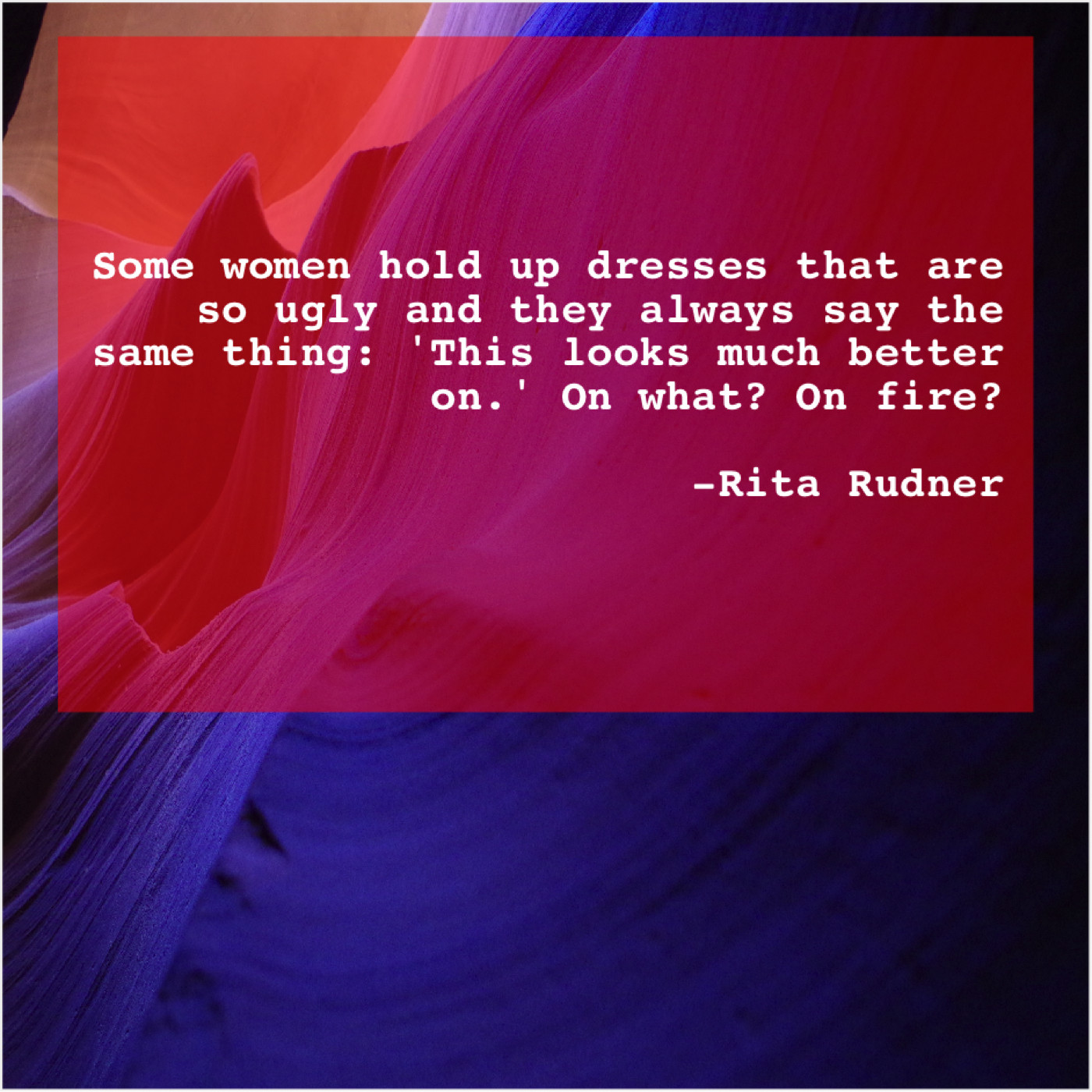 Rita Rudner Rita Rudner – Some women hold up dresses… March 18, 2019 admin “Some women hold up dresses that are so ugly and they always say the same thing: ‘This looks much better on.’ On what? On fire?”-Rita Rudner