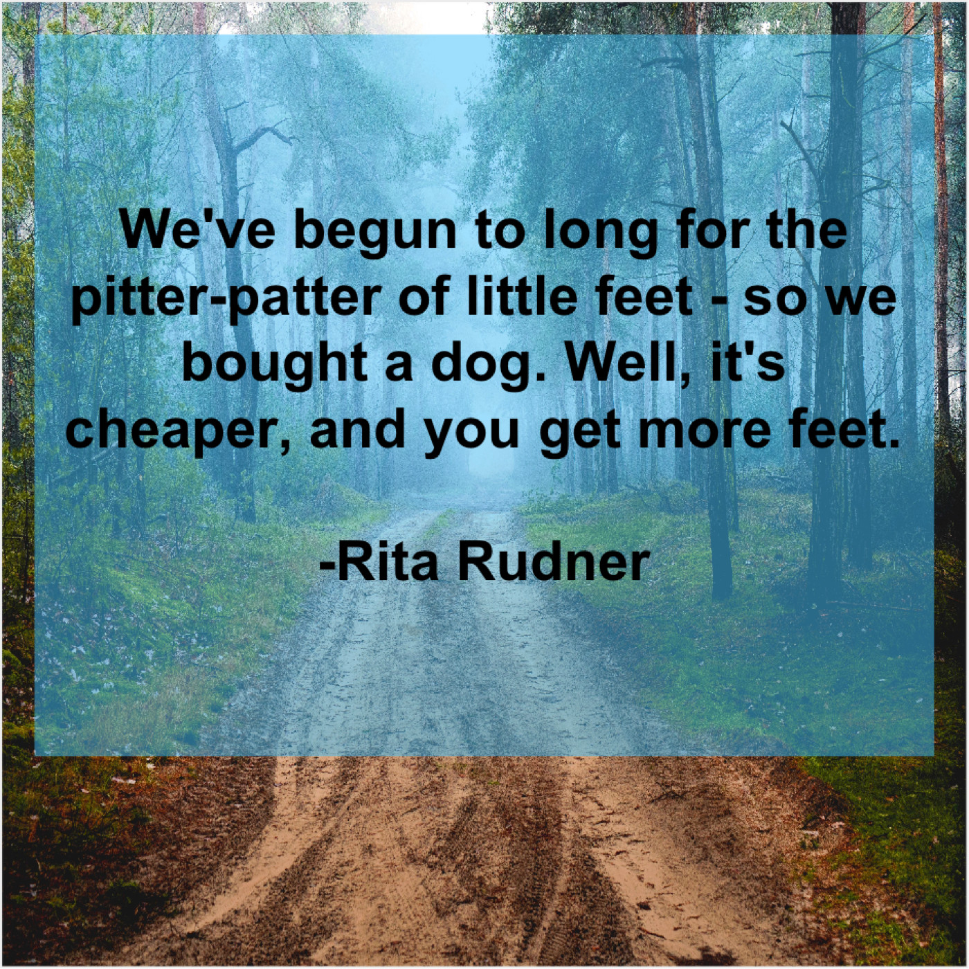 Rita Rudner Rita Rudner – We’ve begun to long for… July 19, 2019 admin “We’ve begun to long for the pitter-patter of little feet – so we bought a dog. Well, it’s cheaper, and you get more feet.”-Rita Rudner