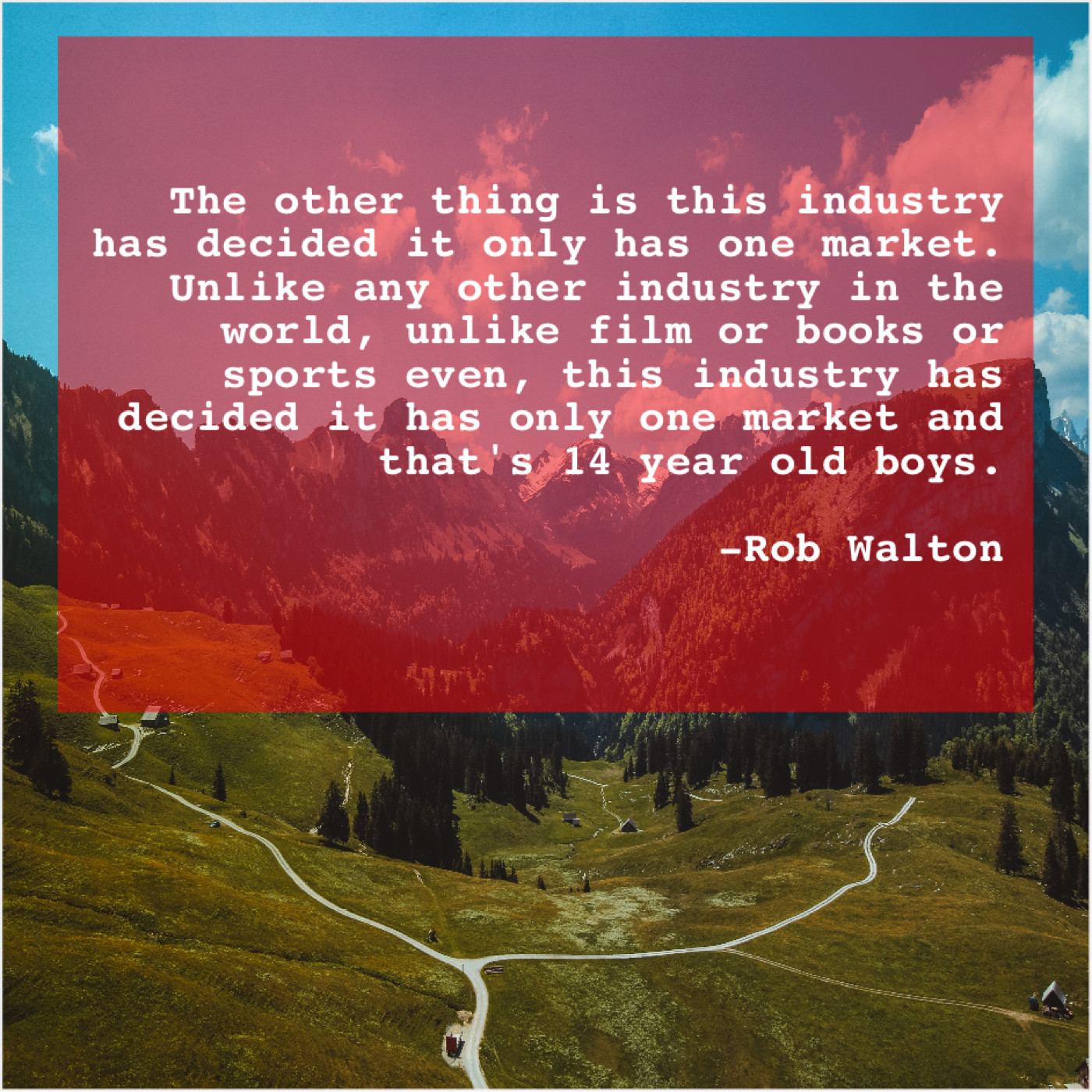 Rob Walton Rob Walton – The other thing is this… February 5, 2019 admin “The other thing is this industry has decided it only has one market. Unlike any other industry in the world, unlike film or books or sports even, this industry has decided it has only one market and that’s 14 year old boys.”-Rob Walton