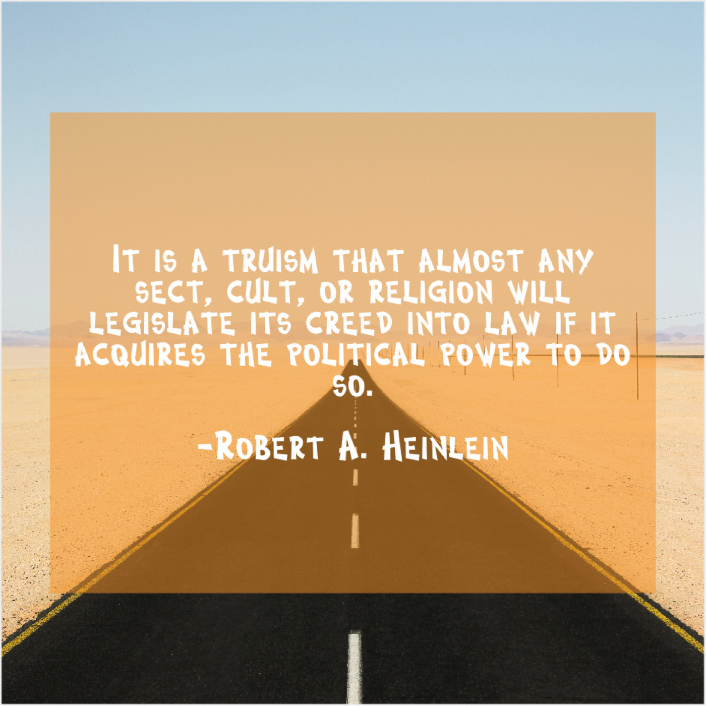 Robert A. Heinlein Robert A. Heinlein – It is a truism that… March 18, 2019 admin “It is a truism that almost any sect, cult, or religion will legislate its creed into law if it acquires the political power to do so.”-Robert A. Heinlein