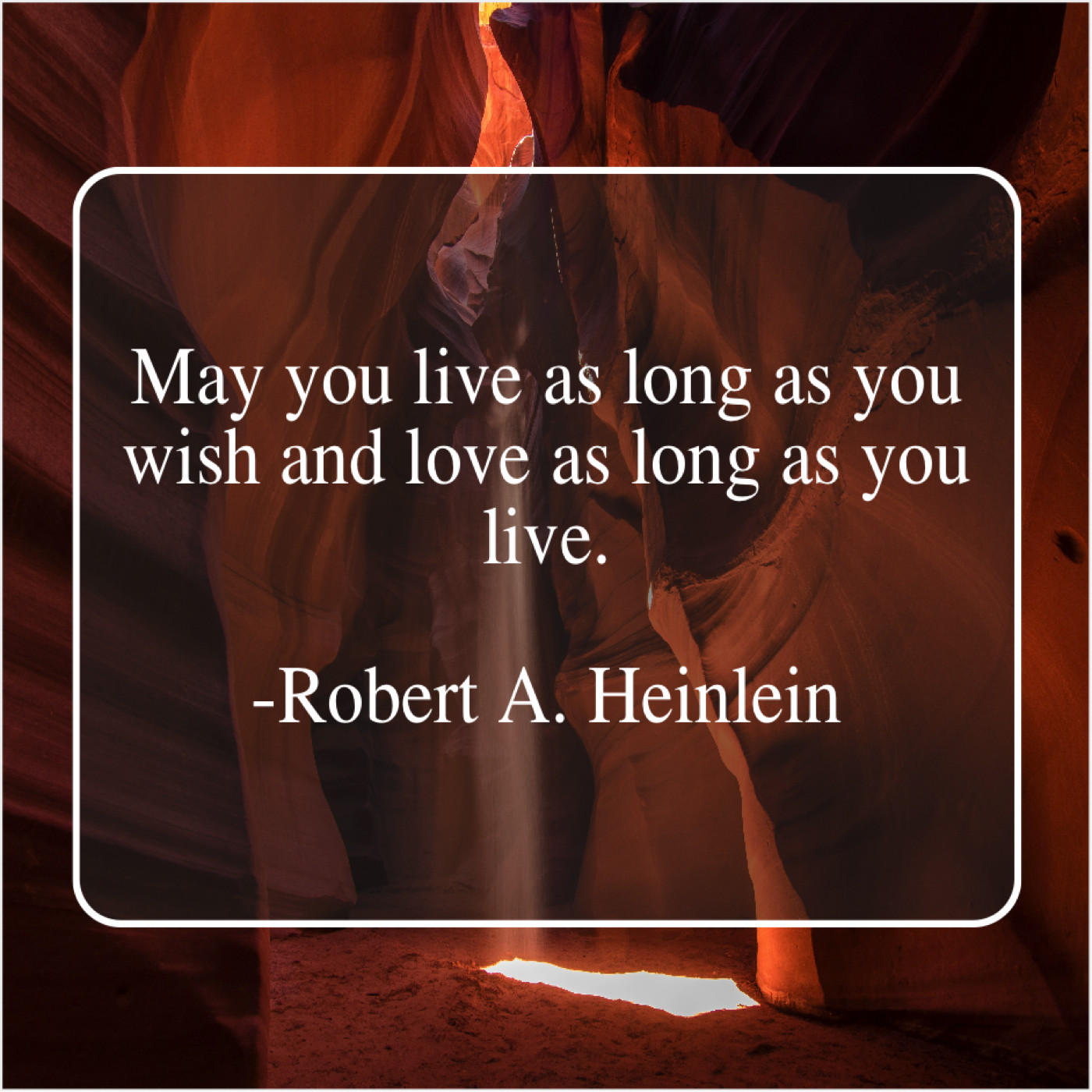 Robert A. Heinlein Robert A. Heinlein – May you live as long… April 20, 2019 admin “May you live as long as you wish and love as long as you live.”-Robert A. Heinlein