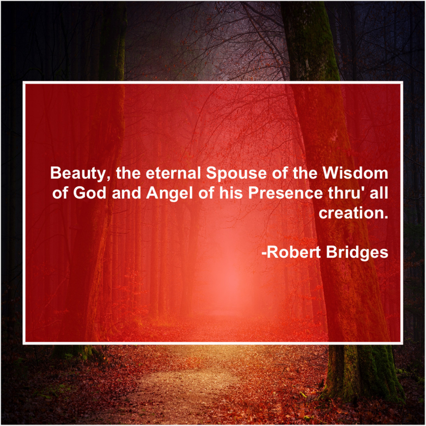 Robert Bridges Robert Bridges – Beauty, the eternal Spouse of… November 1, 2018 admin “Beauty, the eternal Spouse of the Wisdom of God and Angel of his Presence thru’ all creation.”-Robert Bridges
