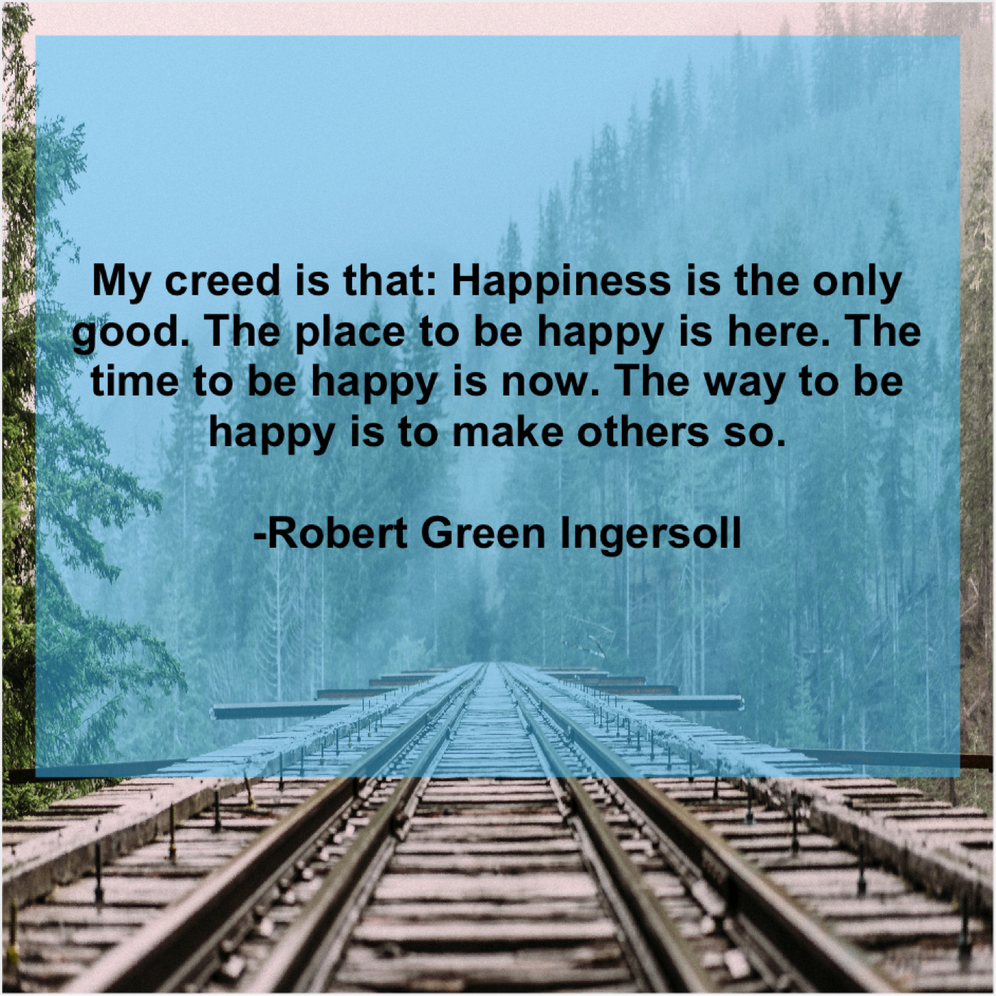 Robert Green Ingersoll Robert Green Ingersoll – My creed is that: Happiness… January 14, 2019 admin “My creed is that: Happiness is the only good. The place to be happy is here. The time to be happy is now. The way to be happy is to make others so.”-Robert Green Ingersoll