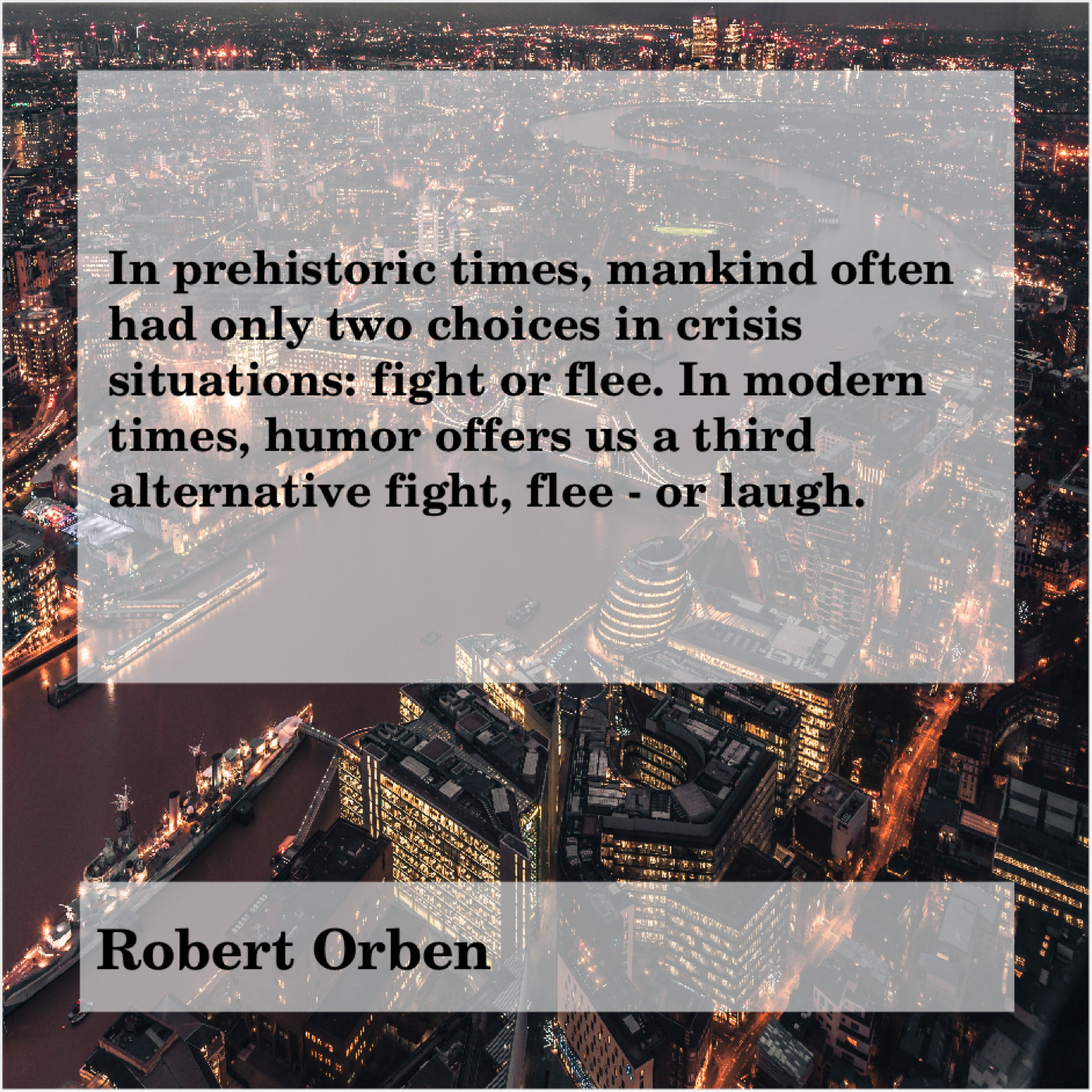Robert Orben Robert Orben – In prehistoric times, mankind often… April 19, 2019 admin “In prehistoric times, mankind often had only two choices in crisis situations: fight or flee. In modern times, humor offers us a third alternative fight, flee – or laugh.”-Robert Orben