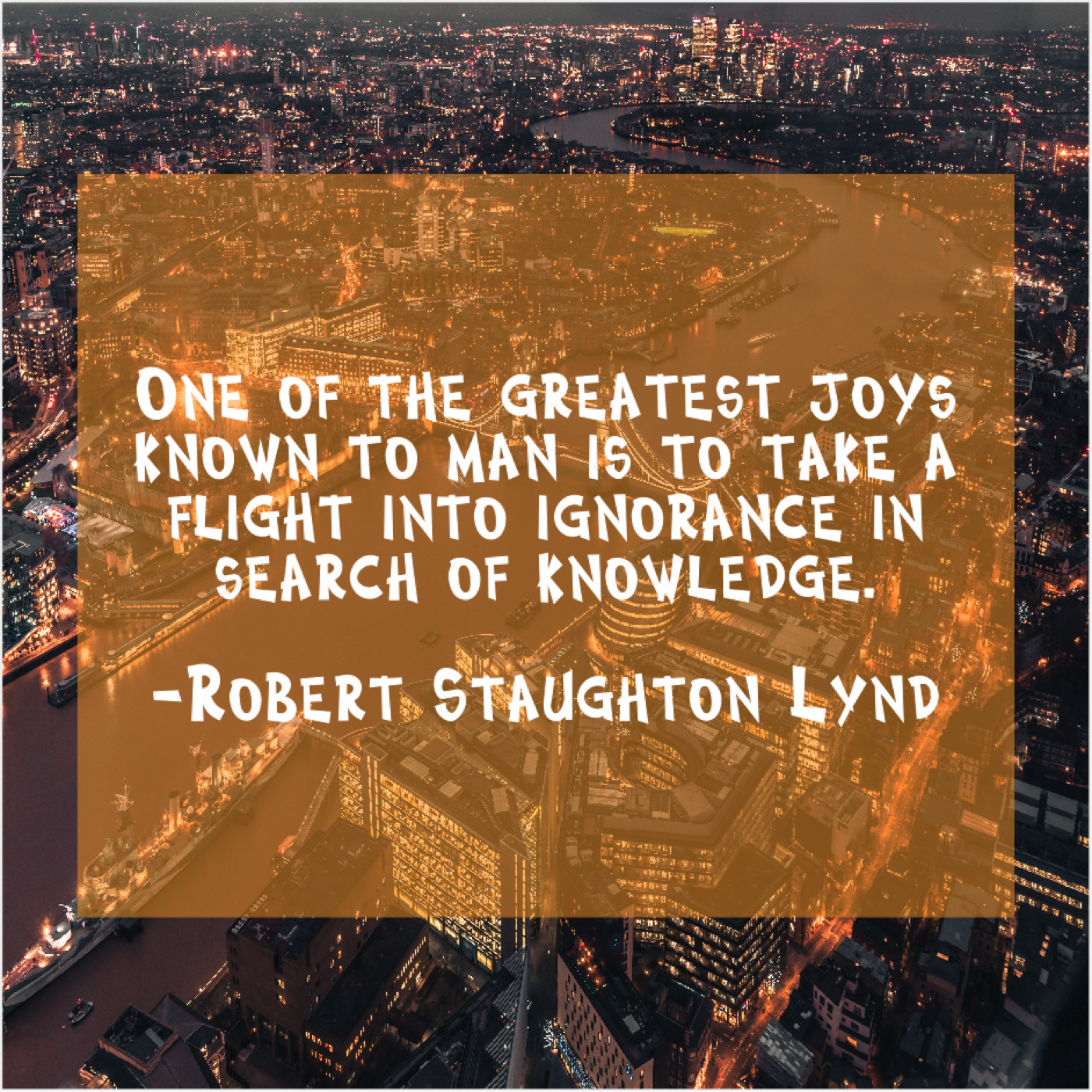 Robert Staughton Lynd Robert Staughton Lynd – One of the greatest joys… April 11, 2019 admin “One of the greatest joys known to man is to take a flight into ignorance in search of knowledge.”-Robert Staughton Lynd