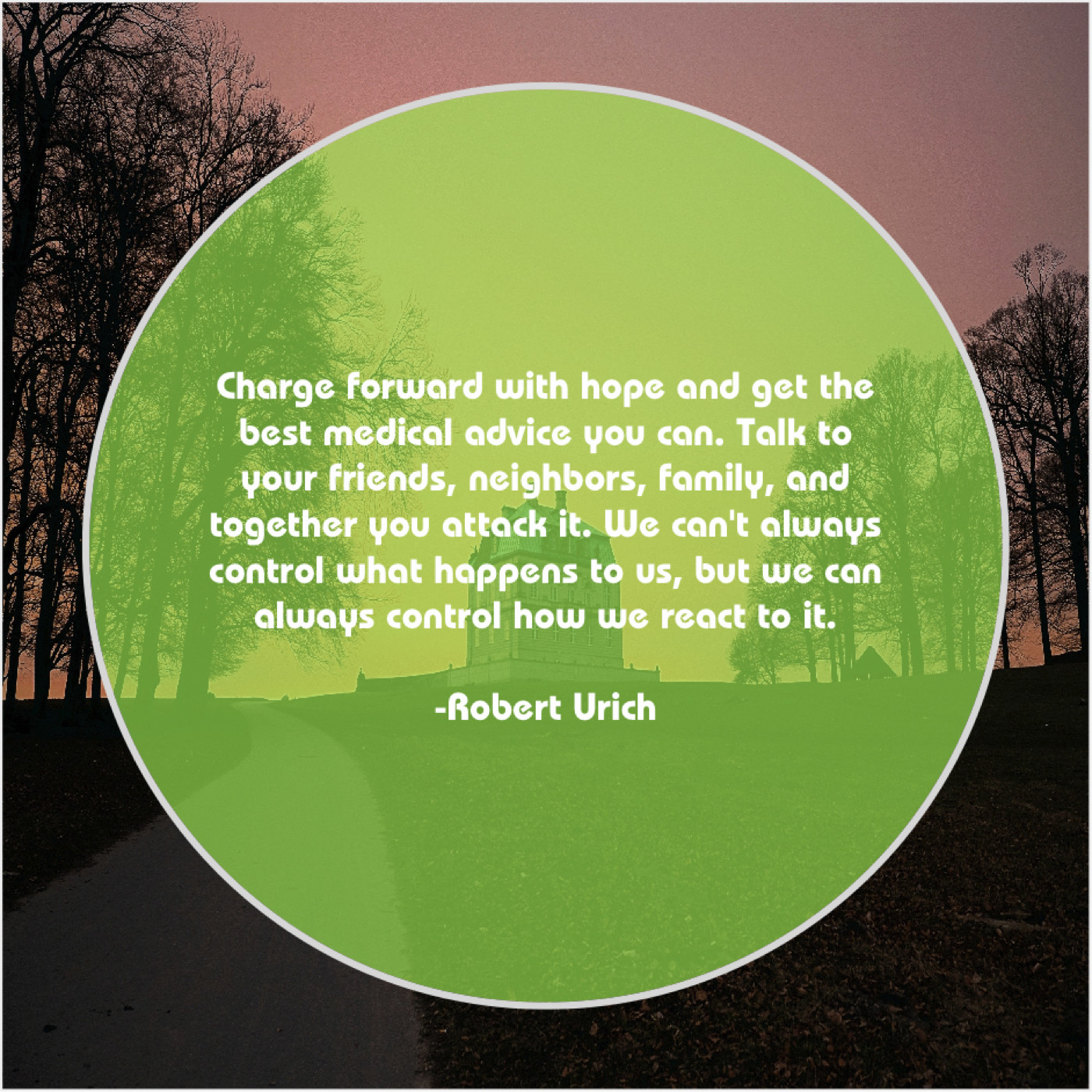 Robert Urich Robert Urich – Charge forward with hope and… November 23, 2018 admin “Charge forward with hope and get the best medical advice you can. Talk to your friends, neighbors, family, and together you attack it. We can’t always control what happens to us, but we can always control how we react to it.”-Robert Urich