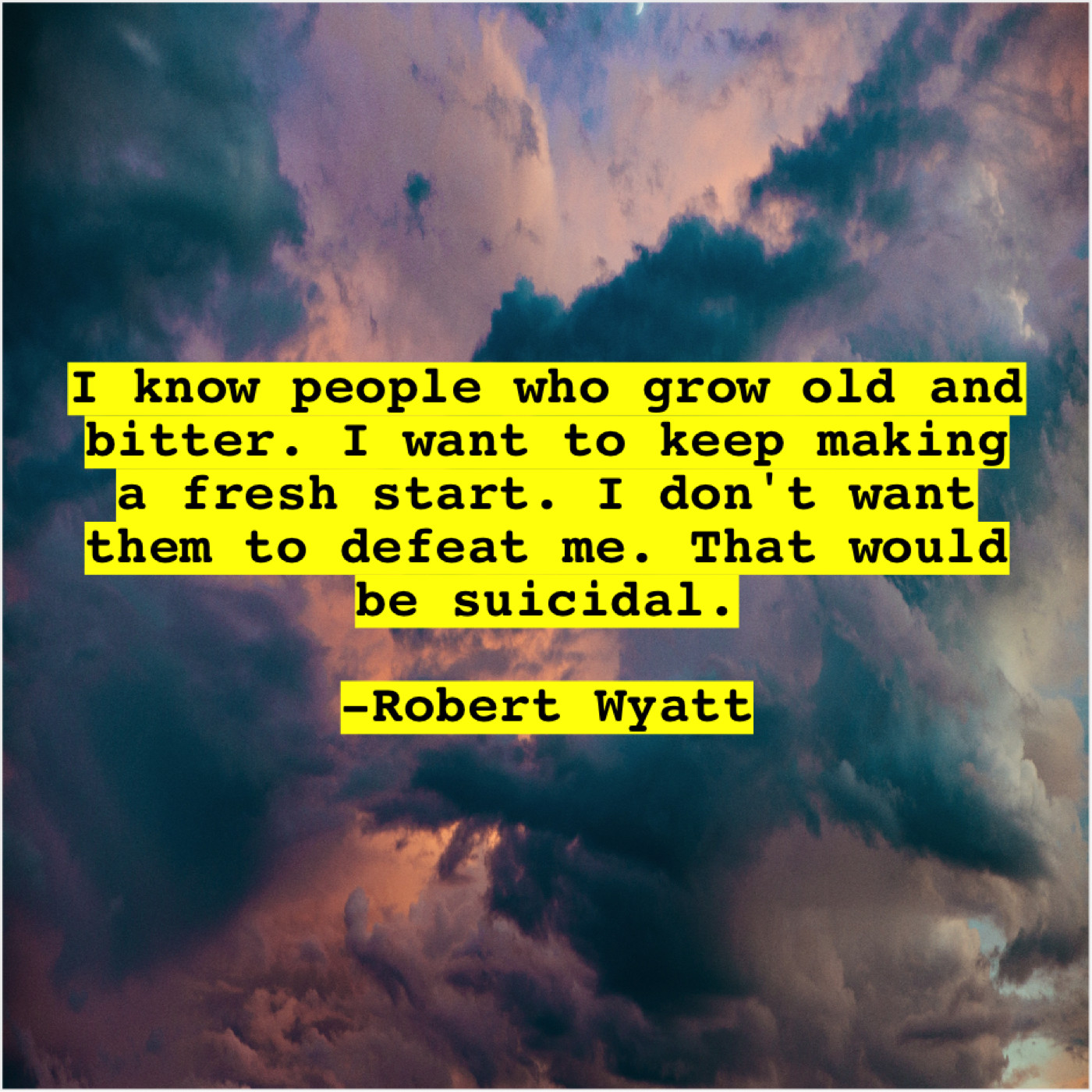 Robert Wyatt Robert Wyatt – I know people who grow… October 22, 2019 admin “I know people who grow old and bitter. I want to keep making a fresh start. I don’t want them to defeat me. That would be suicidal.”-Robert Wyatt