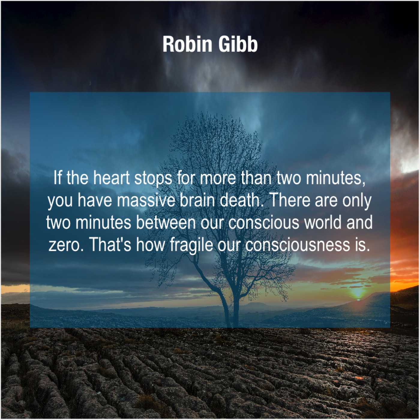 Robin Gibb Robin Gibb – If the heart stops for… March 5, 2019 admin “If the heart stops for more than two minutes, you have massive brain death. There are only two minutes between our conscious world and zero. That’s how fragile our consciousness is.”-Robin Gibb