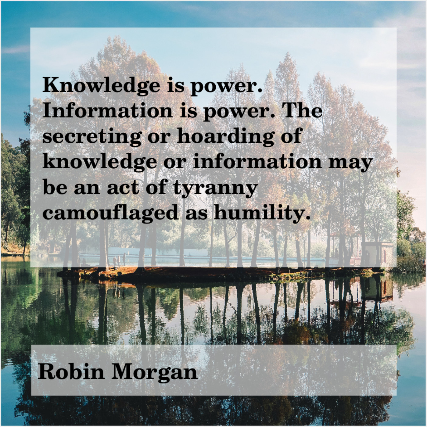 Robin Morgan Robin Morgan – Knowledge is power. Information is… March 21, 2019 admin “Knowledge is power. Information is power. The secreting or hoarding of knowledge or information may be an act of tyranny camouflaged as humility.”-Robin Morgan
