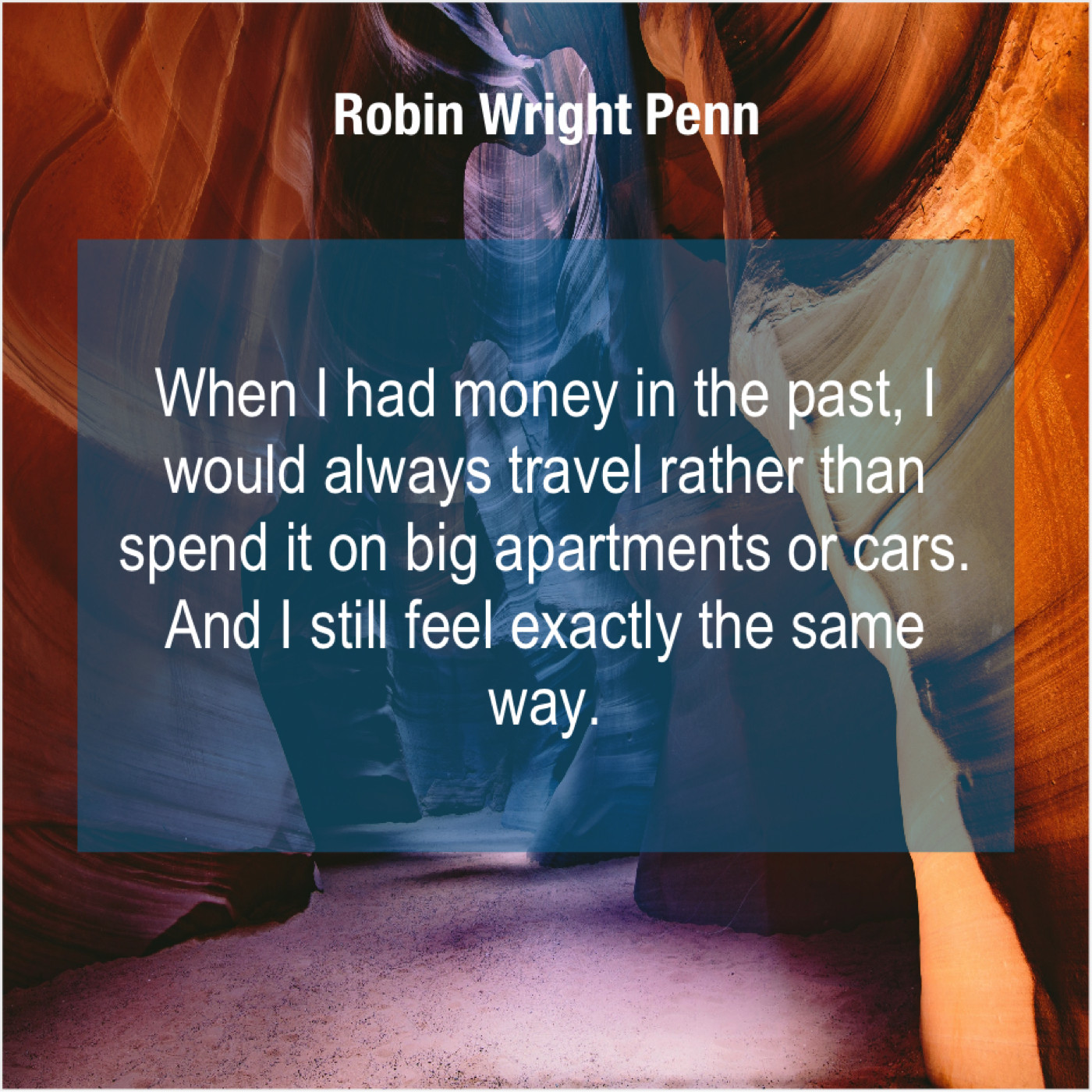 Robin Wright Penn Robin Wright Penn – When I had money in… September 12, 2019 admin “When I had money in the past, I would always travel rather than spend it on big apartments or cars. And I still feel exactly the same way.”-Robin Wright Penn