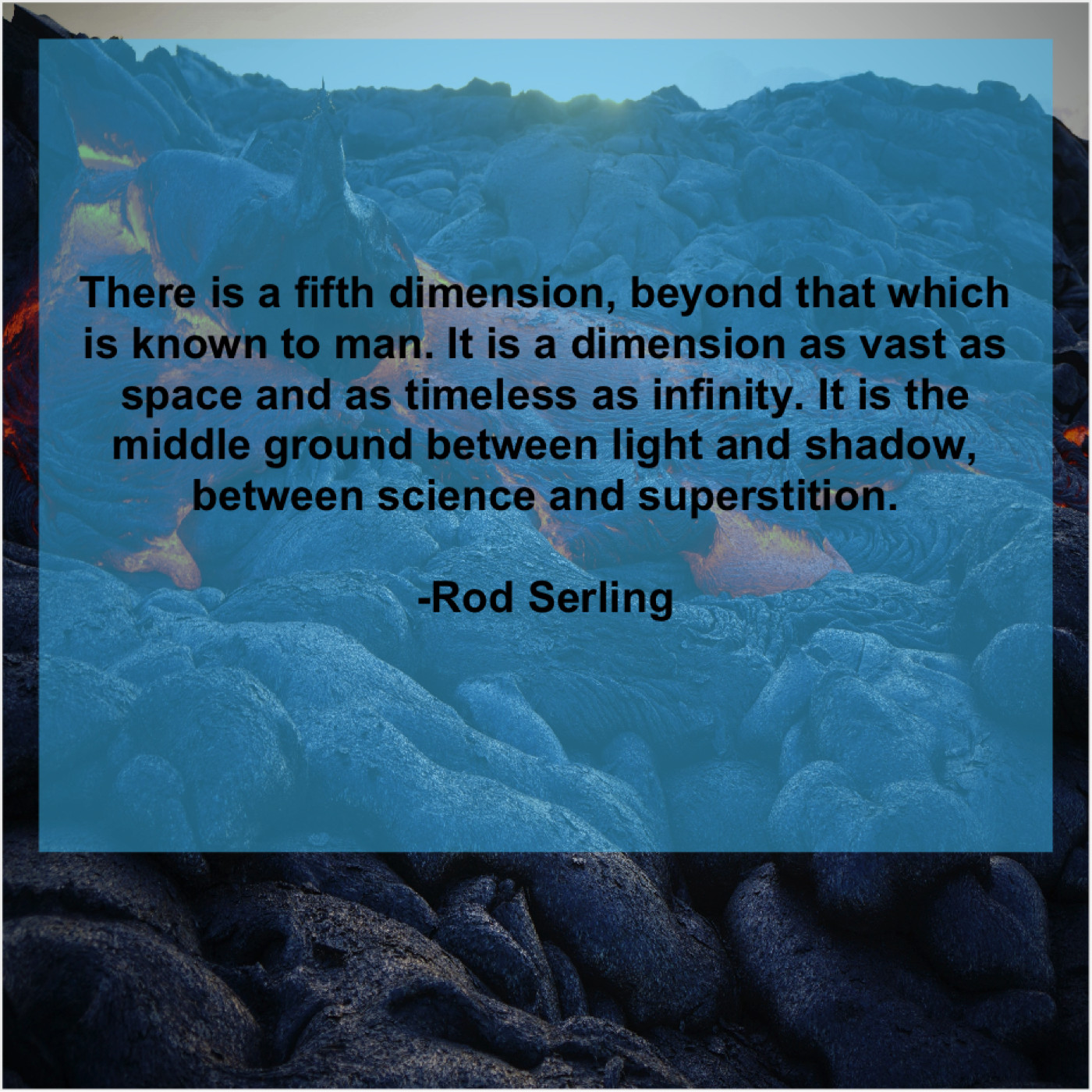Rod Serling Rod Serling – There is a fifth dimension… July 27, 2019 admin “There is a fifth dimension, beyond that which is known to man. It is a dimension as vast as space and as timeless as infinity. It is the middle ground between light and shadow, between science and superstition.”-Rod Serling