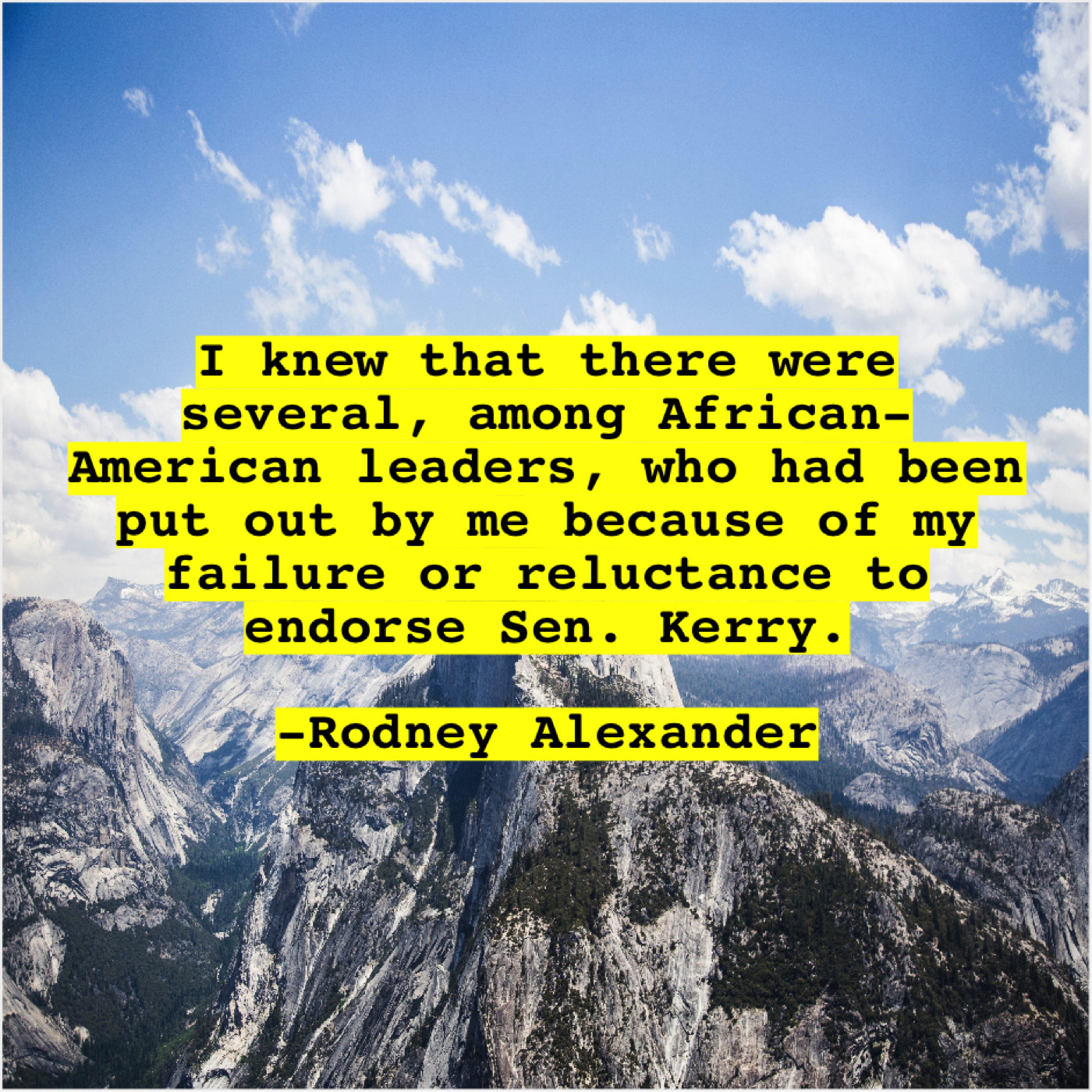 Rodney Alexander Rodney Alexander – I knew that there were… June 27, 2019 admin “I knew that there were several, among African-American leaders, who had been put out by me because of my failure or reluctance to endorse Sen. Kerry.”-Rodney Alexander