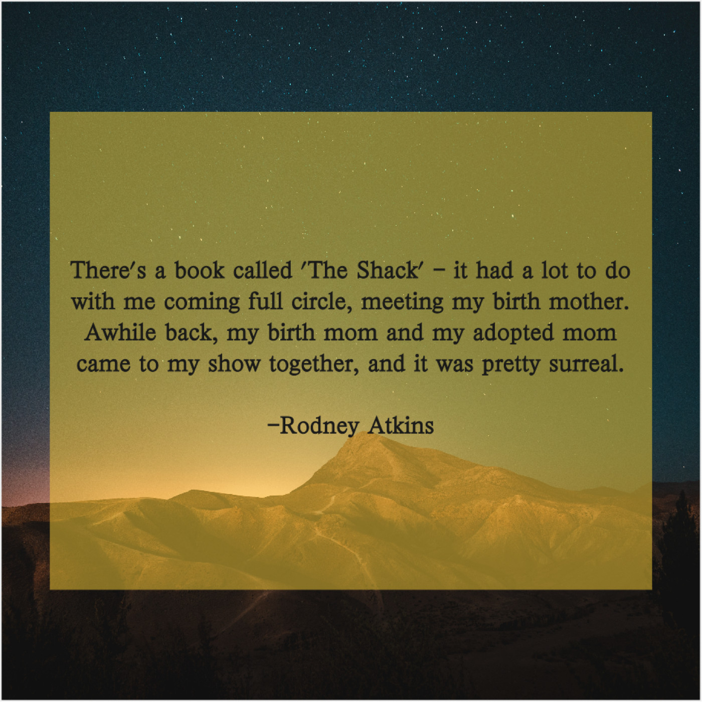 Rodney Atkins Rodney Atkins – There’s a book called ‘The… September 6, 2019 admin “There’s a book called ‘The Shack’ – it had a lot to do with me coming full circle, meeting my birth mother. Awhile back, my birth mom and my adopted mom came to my show together, and it was pretty surreal.”-Rodney Atkins
