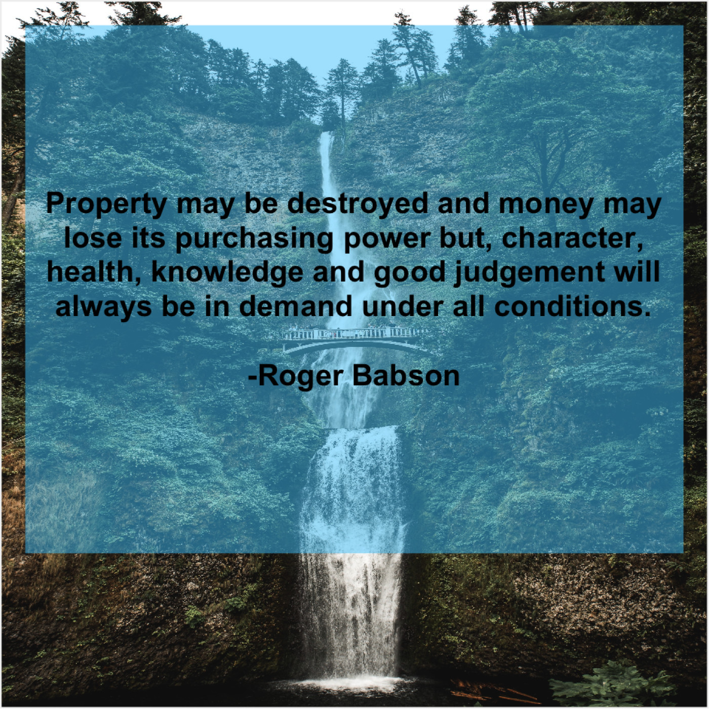 Roger Babson Roger Babson – Property may be destroyed and… June 5, 2019 admin “Property may be destroyed and money may lose its purchasing power but, character, health, knowledge and good judgement will always be in demand under all conditions.”-Roger Babson