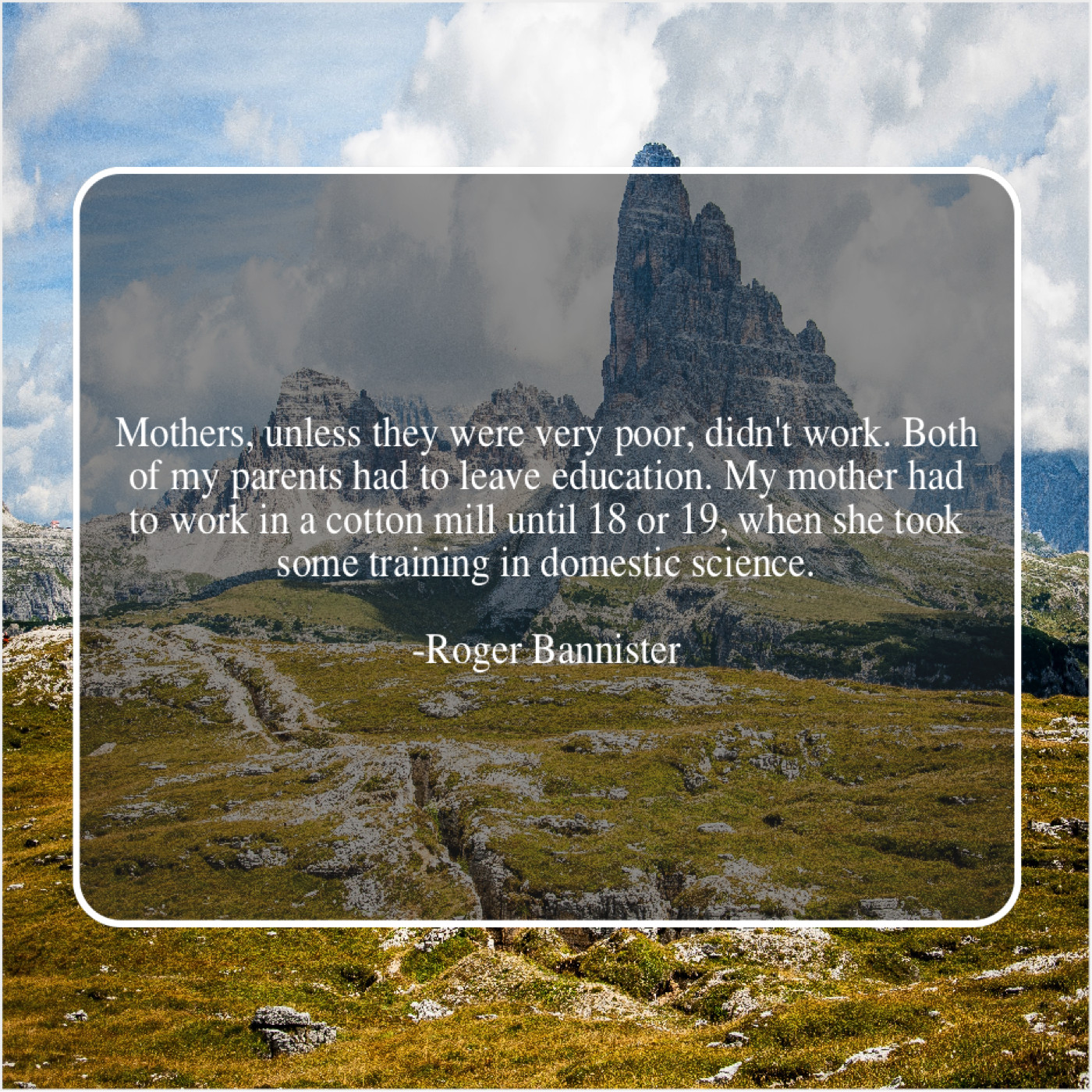 Roger Bannister Roger Bannister – Mothers, unless they were very… September 10, 2019 admin “Mothers, unless they were very poor, didn’t work. Both of my parents had to leave education. My mother had to work in a cotton mill until 18 or 19, when she took some training in domestic science.”-Roger Bannister