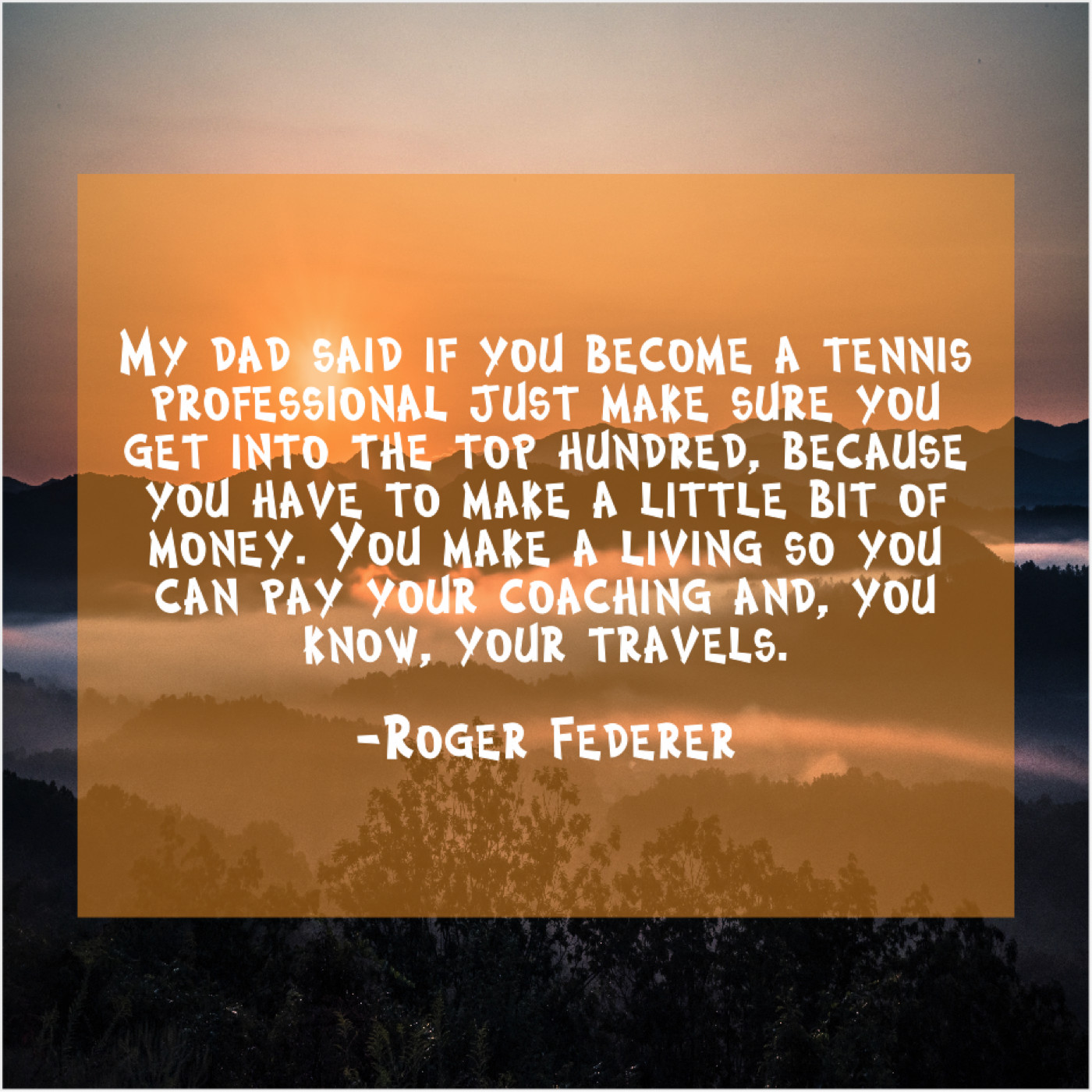 Roger Federer Roger Federer – My dad said if you… November 20, 2018 admin “My dad said if you become a tennis professional just make sure you get into the top hundred, because you have to make a little bit of money. You make a living so you can pay your coaching and, you know, your travels.”-Roger Federer