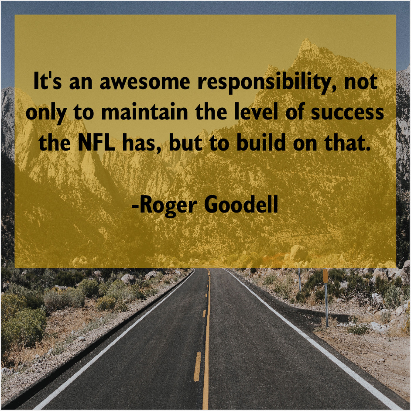 Roger Goodell Roger Goodell – It’s an awesome responsibility, not… July 4, 2019 admin “It’s an awesome responsibility, not only to maintain the level of success the NFL has, but to build on that.”-Roger Goodell