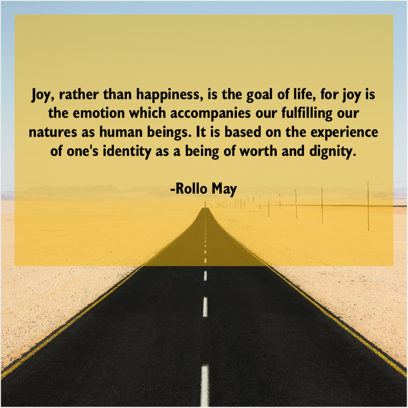 Rollo May Rollo May – Joy, rather than happiness, is… August 27, 2019 admin “Joy, rather than happiness, is the goal of life, for joy is the emotion which accompanies our fulfilling our natures as human beings. It is based on the experience of one’s identity as a being of worth and dignity.”-Rollo May