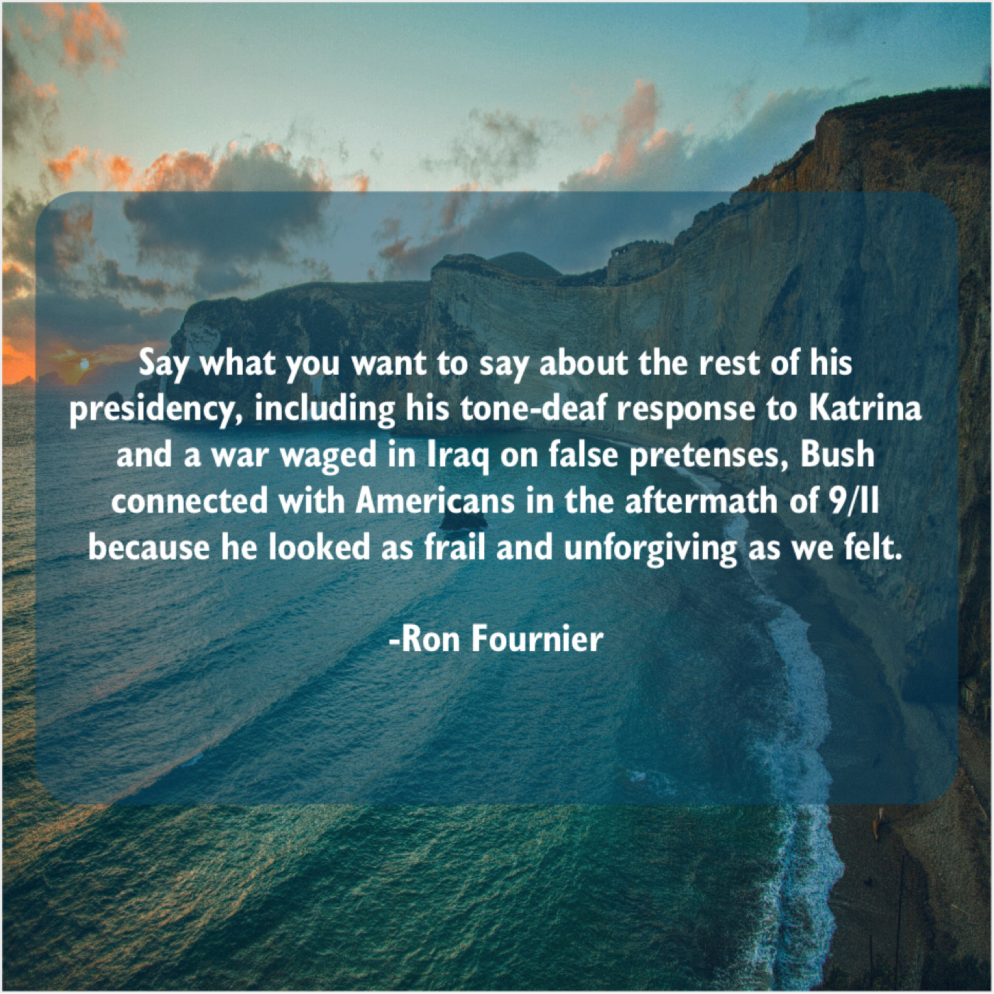 “Say what you want to say about the rest of his presidency, including his tone-deaf response to Katrina and a war waged in Iraq on false pretenses, Bush connected with Americans in the aftermath of 9/11 because he looked as frail and unforgiving as we felt.”