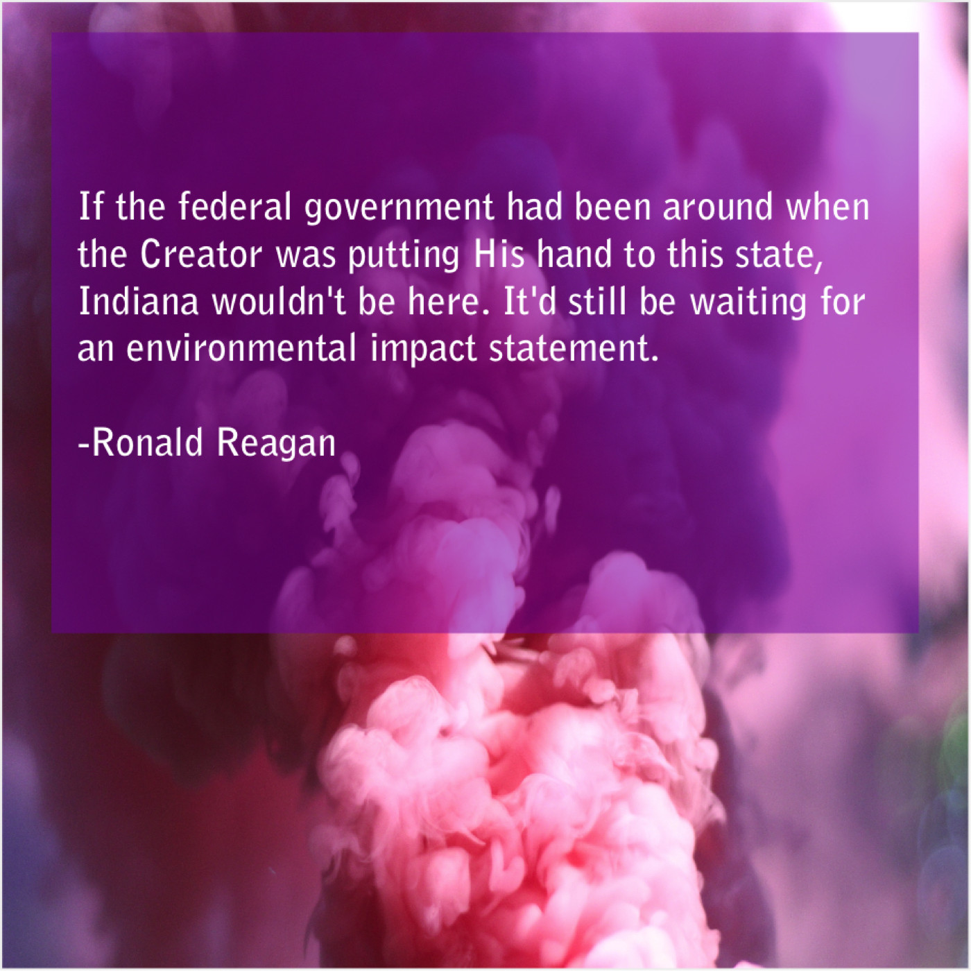 Ronald Reagan Ronald Reagan – If the federal government had… May 5, 2019 admin “If the federal government had been around when the Creator was putting His hand to this state, Indiana wouldn’t be here. It’d still be waiting for an environmental impact statement.”-Ronald Reagan