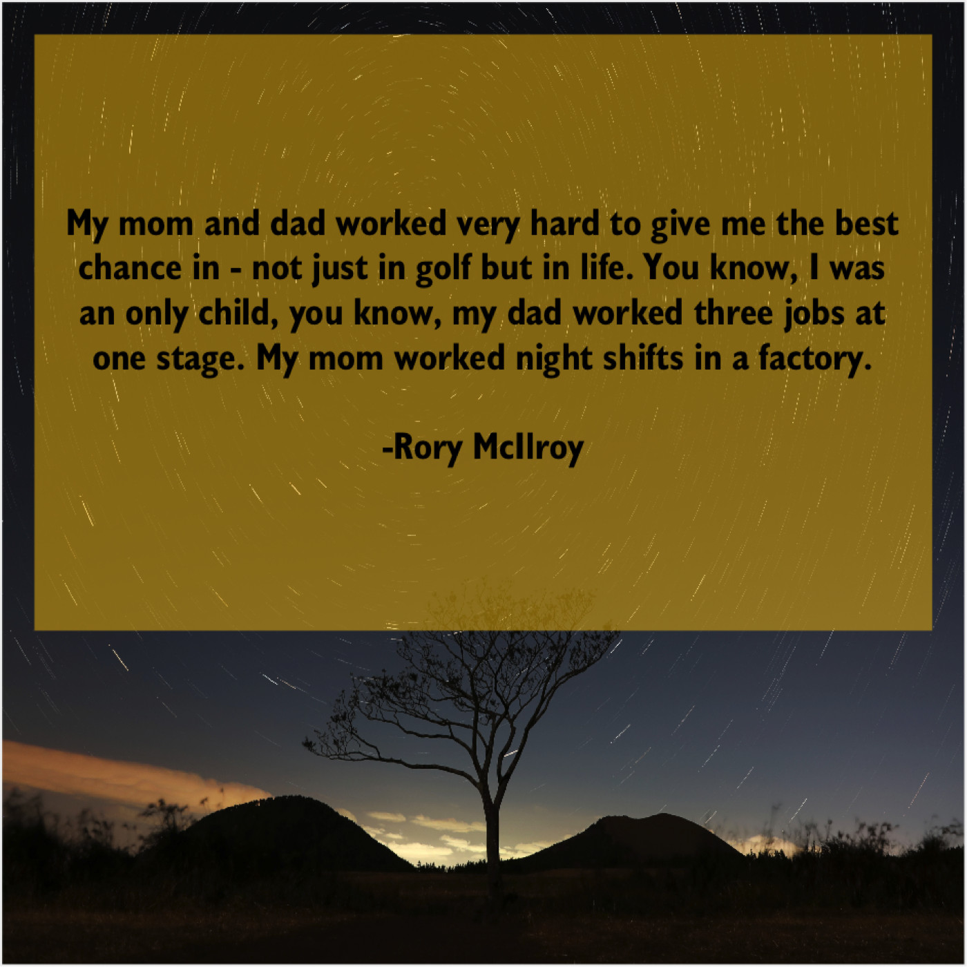 Rory McIlroy Rory McIlroy – My mom and dad worked… May 18, 2019 admin “My mom and dad worked very hard to give me the best chance in – not just in golf but in life. You know, I was an only child, you know, my dad worked three jobs at one stage. My mom worked night shifts in a factory.”-Rory McIlroy