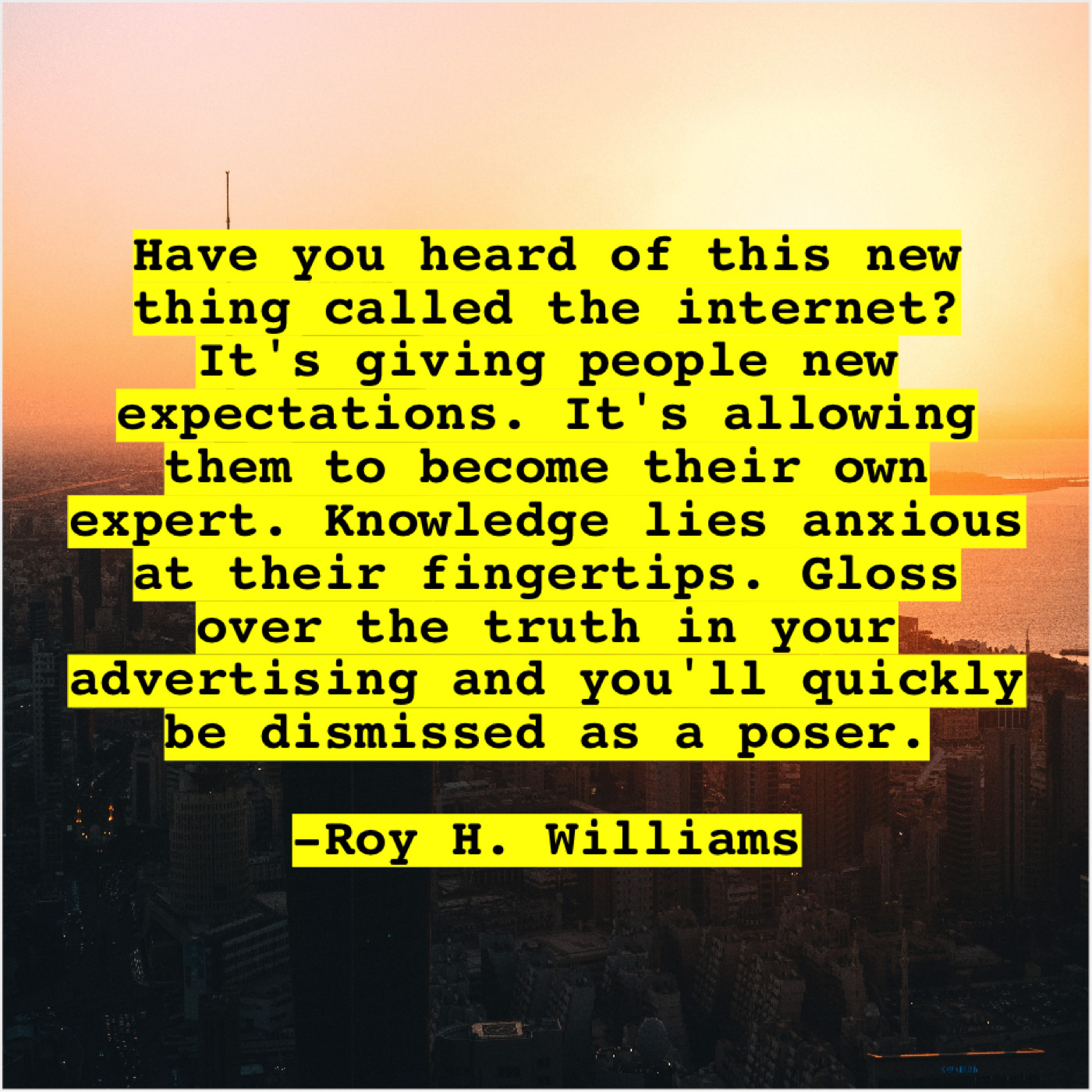 “Have you heard of this new thing called the internet? It’s giving people new expectations. It’s allowing them to become their own expert. Knowledge lies anxious at their fingertips. Gloss over the truth in your advertising and you’ll quickly be dismissed as a poser.”