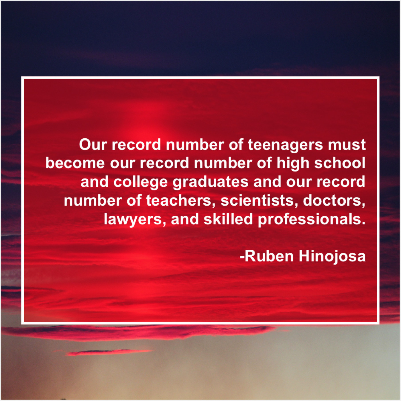 Ruben Hinojosa Ruben Hinojosa – Our record number of teenagers… July 26, 2019 admin “Our record number of teenagers must become our record number of high school and college graduates and our record number of teachers, scientists, doctors, lawyers, and skilled professionals.”-Ruben Hinojosa