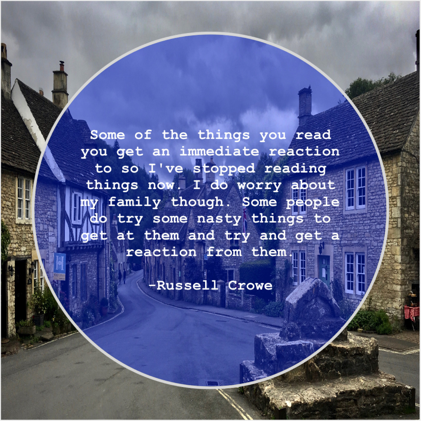 Russell Crowe Russell Crowe – Some of the things you… June 12, 2019 admin “Some of the things you read you get an immediate reaction to so I’ve stopped reading things now. I do worry about my family though. Some people do try some nasty things to get at them and try and get a reaction from them.”-Russell Crowe