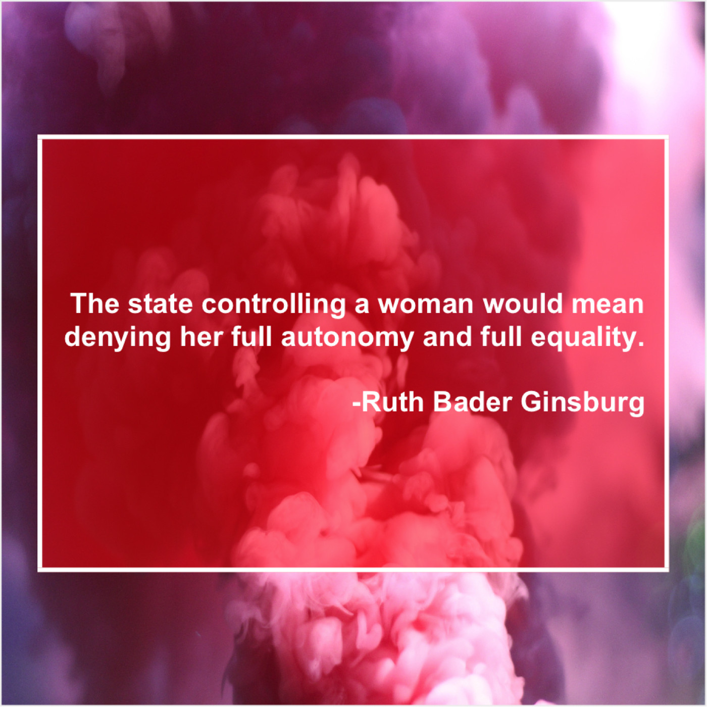 Ruth Bader Ginsburg Ruth Bader Ginsburg – The state controlling a woman… October 20, 2019 admin “The state controlling a woman would mean denying her full autonomy and full equality.”-Ruth Bader Ginsburg