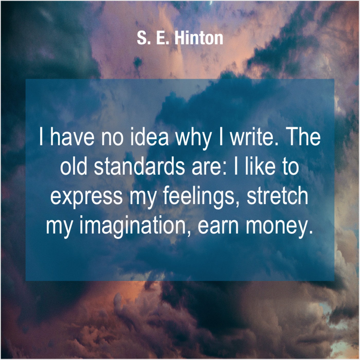S. E. Hinton S. E. Hinton – I have no idea why… September 6, 2019 admin “I have no idea why I write. The old standards are: I like to express my feelings, stretch my imagination, earn money.”-S. E. Hinton