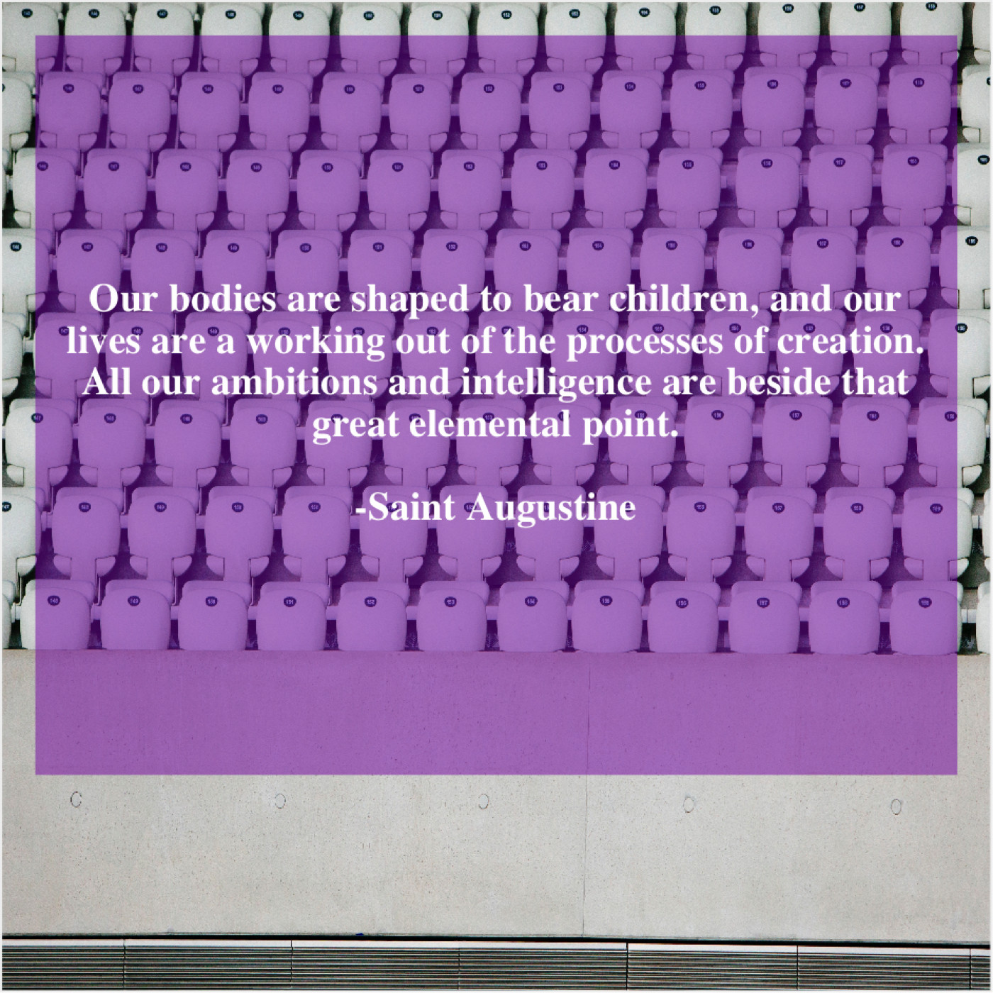 Saint Augustine Saint Augustine – Our bodies are shaped to… June 2, 2019 admin “Our bodies are shaped to bear children, and our lives are a working out of the processes of creation. All our ambitions and intelligence are beside that great elemental point.”-Saint Augustine