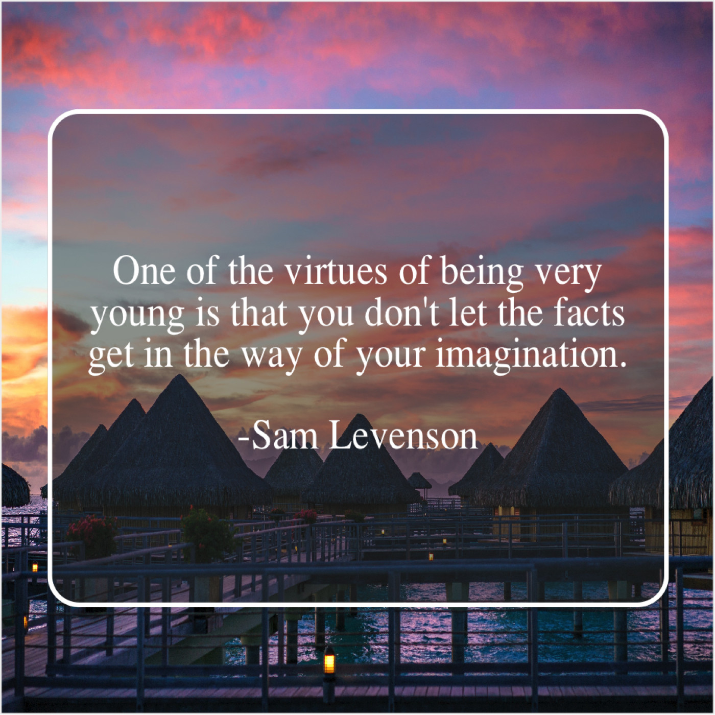 Sam Levenson Sam Levenson – One of the virtues of… March 23, 2019 admin “One of the virtues of being very young is that you don’t let the facts get in the way of your imagination.”-Sam Levenson