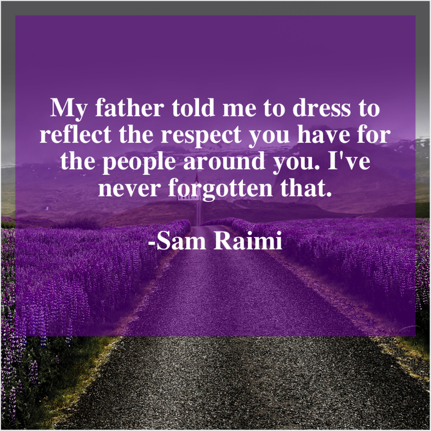 Sam Raimi Sam Raimi – My father told me to… August 29, 2019 admin “My father told me to dress to reflect the respect you have for the people around you. I’ve never forgotten that.”-Sam Raimi