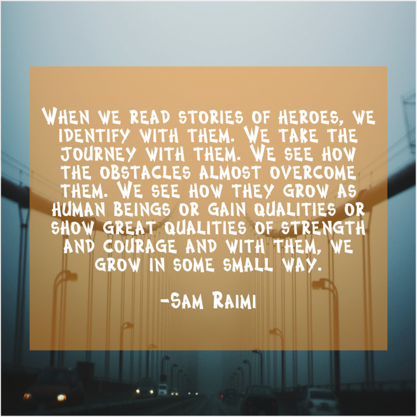 “When we read stories of heroes, we identify with them. We take the journey with them. We see how the obstacles almost overcome them. We see how they grow as human beings or gain qualities or show great qualities of strength and courage and with them, we grow in some small way.”