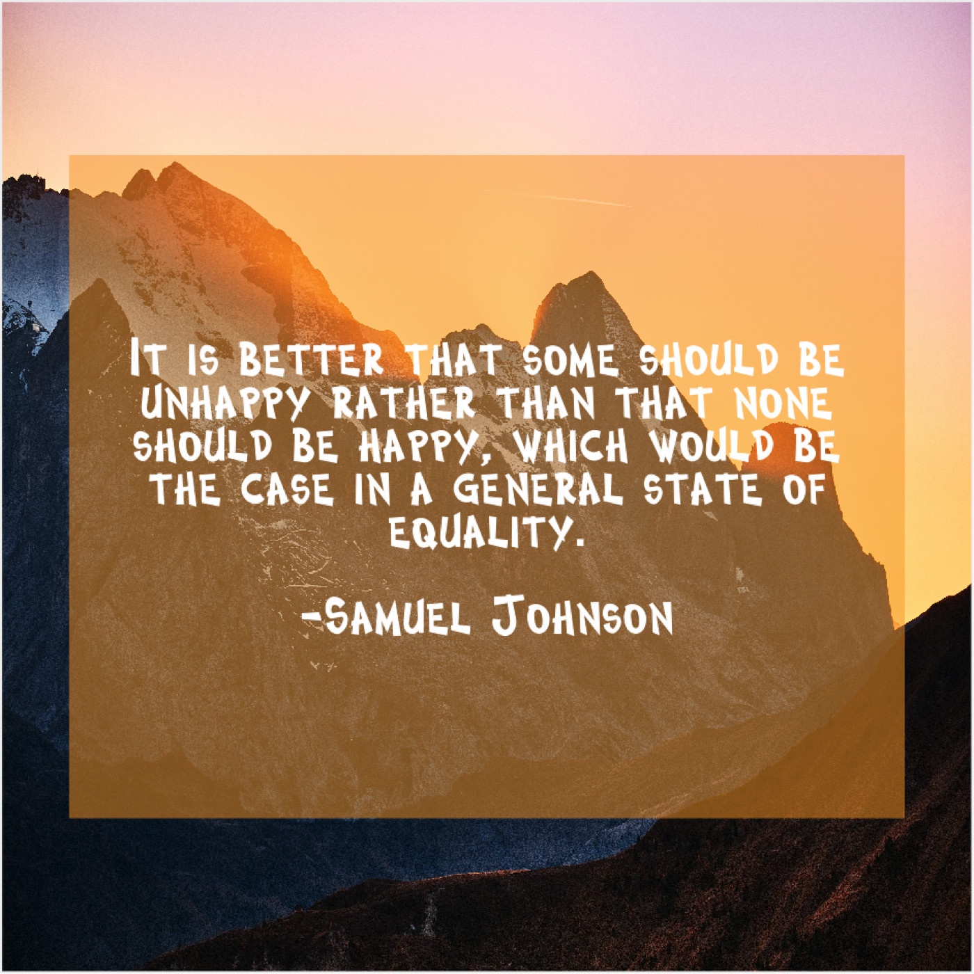 Samuel Johnson Samuel Johnson – It is better that some… May 26, 2019 admin “It is better that some should be unhappy rather than that none should be happy, which would be the case in a general state of equality.”-Samuel Johnson