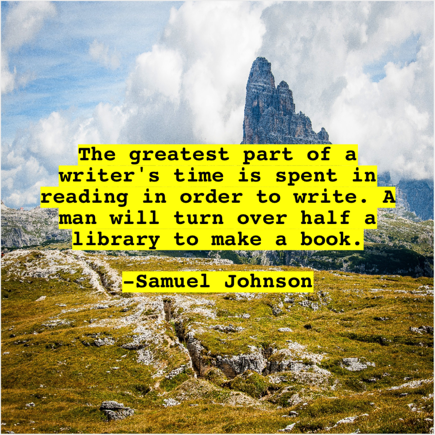 Samuel Johnson Samuel Johnson – The greatest part of a… September 11, 2019 admin “The greatest part of a writer’s time is spent in reading in order to write. A man will turn over half a library to make a book.”-Samuel Johnson